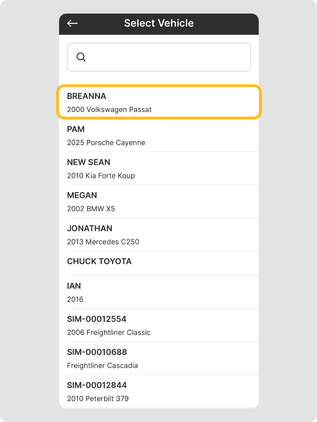 - In the Motive Driver App, select Vehicle inspection and select your vehicle.