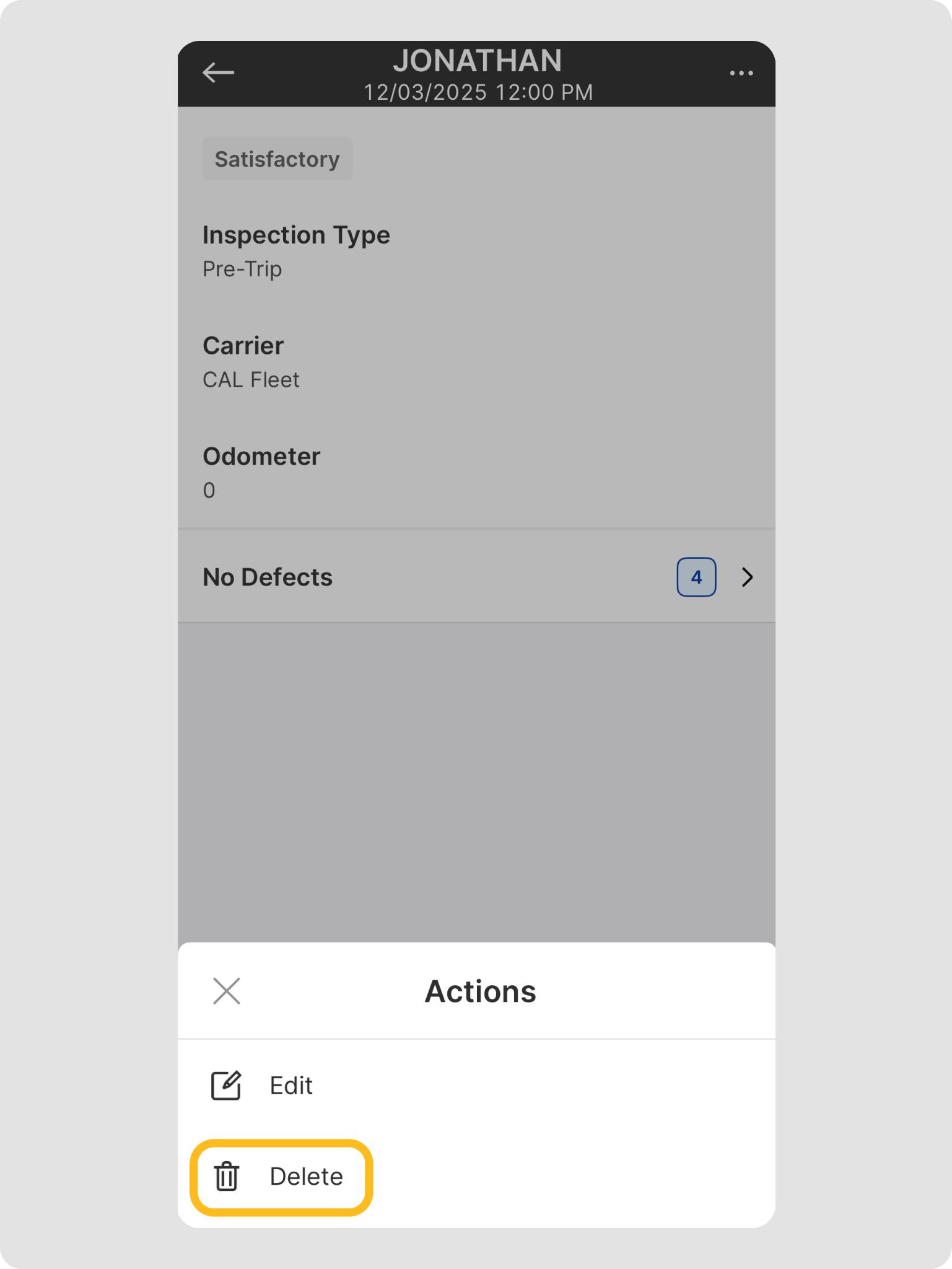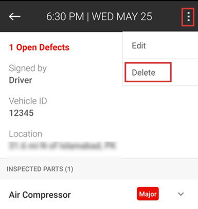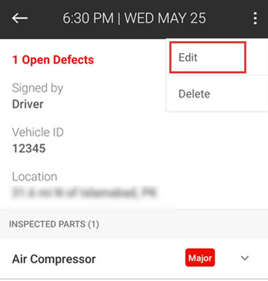 | Note: The vehicle and trailer defect reports will display separately. You can edit or delete the reports one by one, following the same steps. |