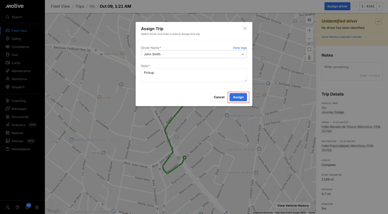 Fleet Manager Assigning an Unidentified Regulated Trip on Fleet Dashboard