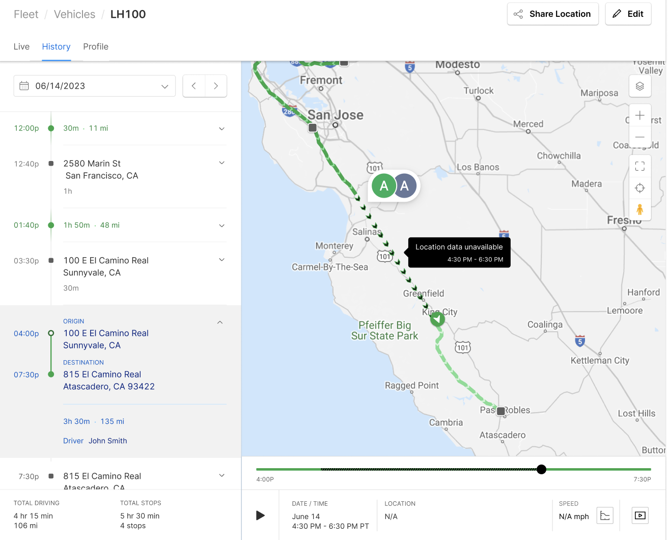 - Fleet Managers can hover over these dotted lines to receive a notification that explains the data is unavailable for that portion of the trip. This differentiation makes it easier to distinguish between complete and incomplete data.