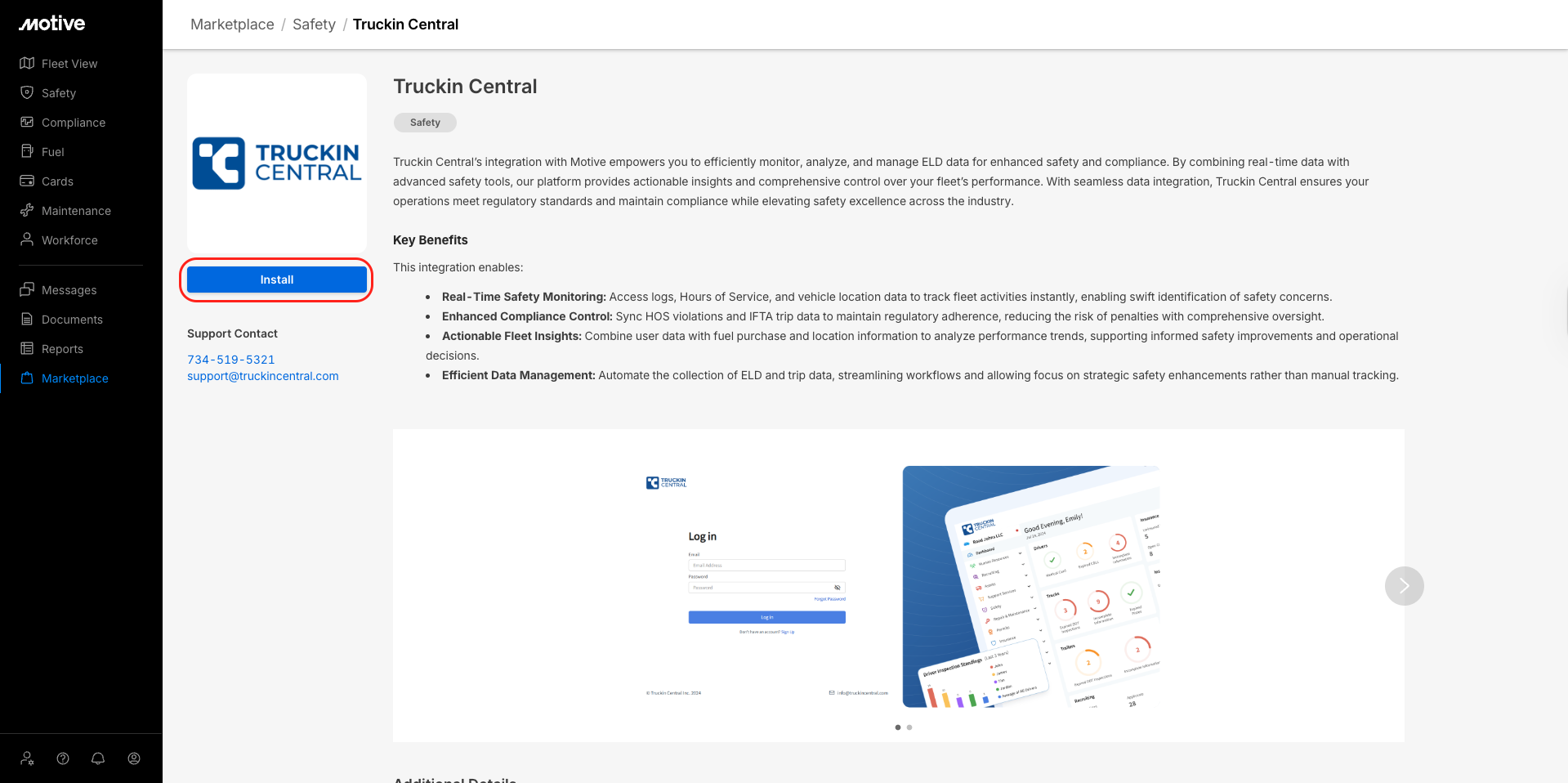 | Note: Click the Install button on the Motive standalone marketplace. The integration process is triggered on Truckin Central's ends |
