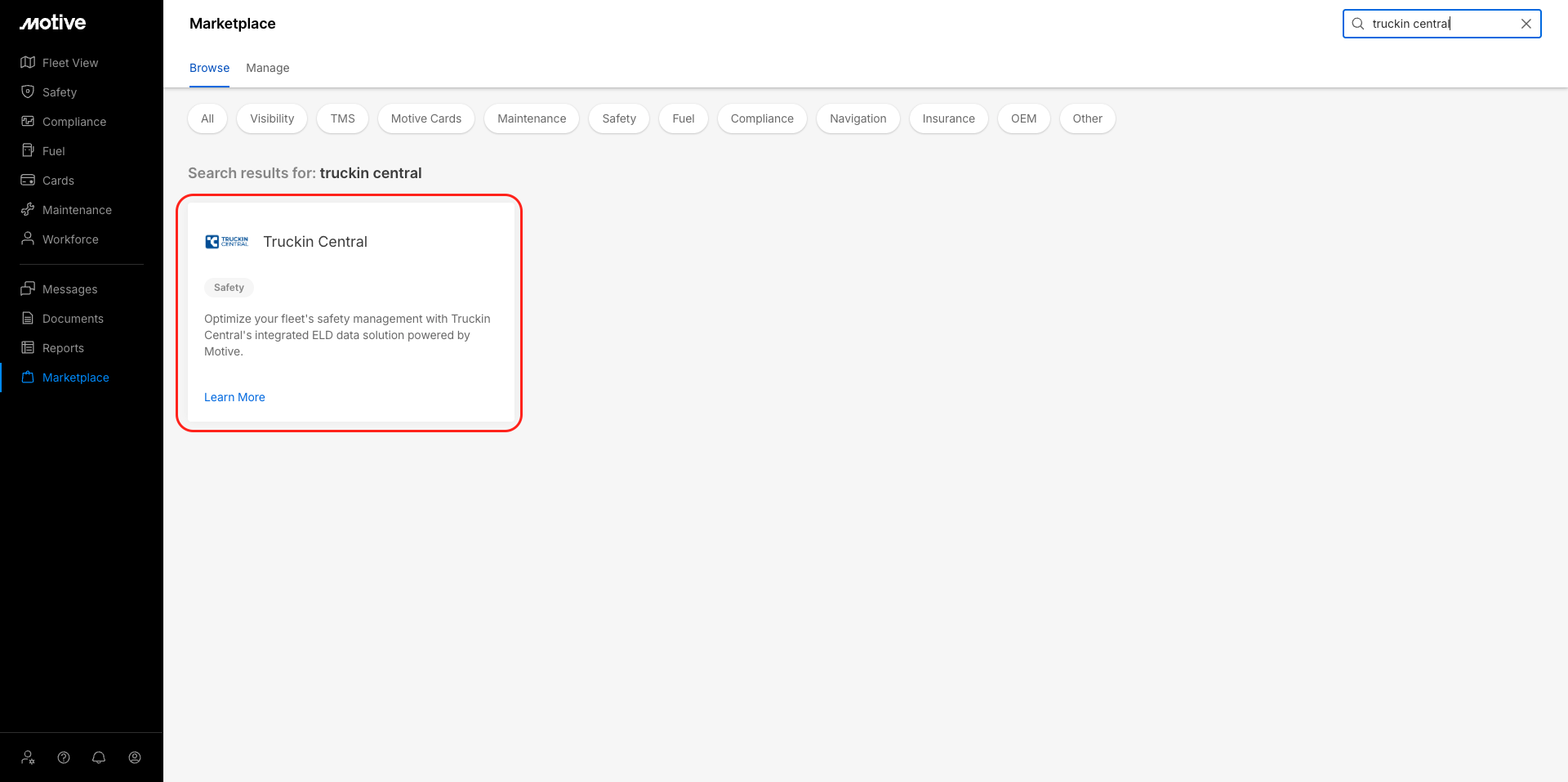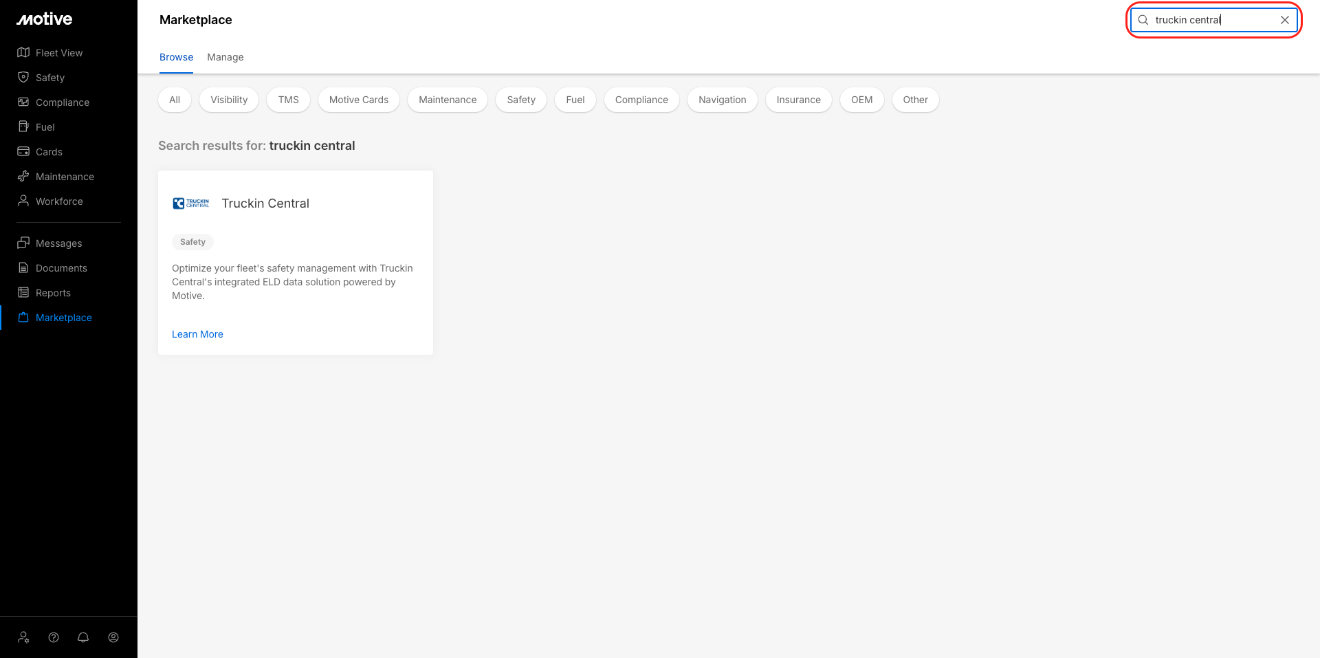 Log in to the Motive Fleet Dashboard and click Marketplace.