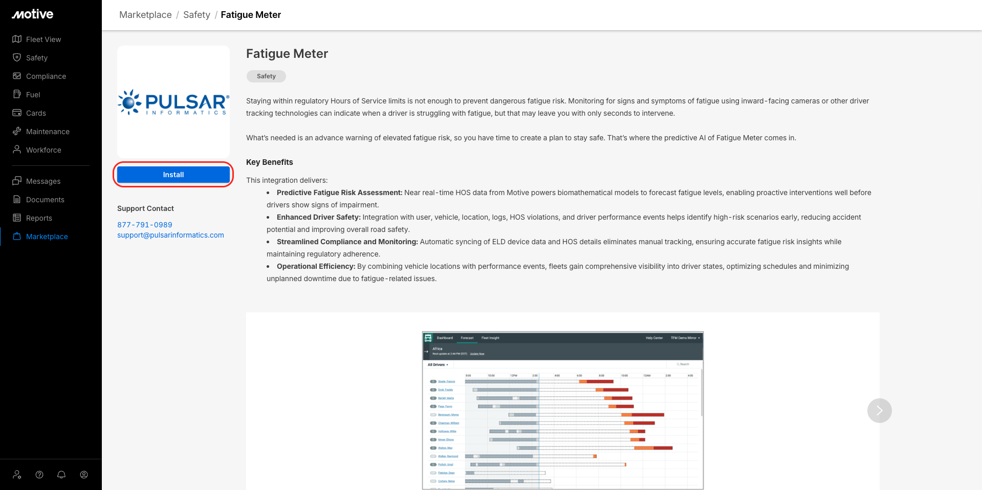 | Note: Click the Install button on the Motive standalone marketplace. The integration process is triggered on Fatigue Meter's ends |