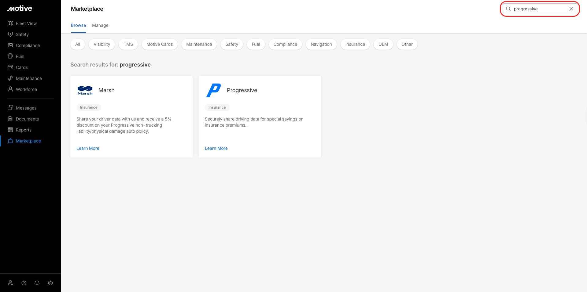Log in to the Motive Fleet Dashboard and click Marketplace.