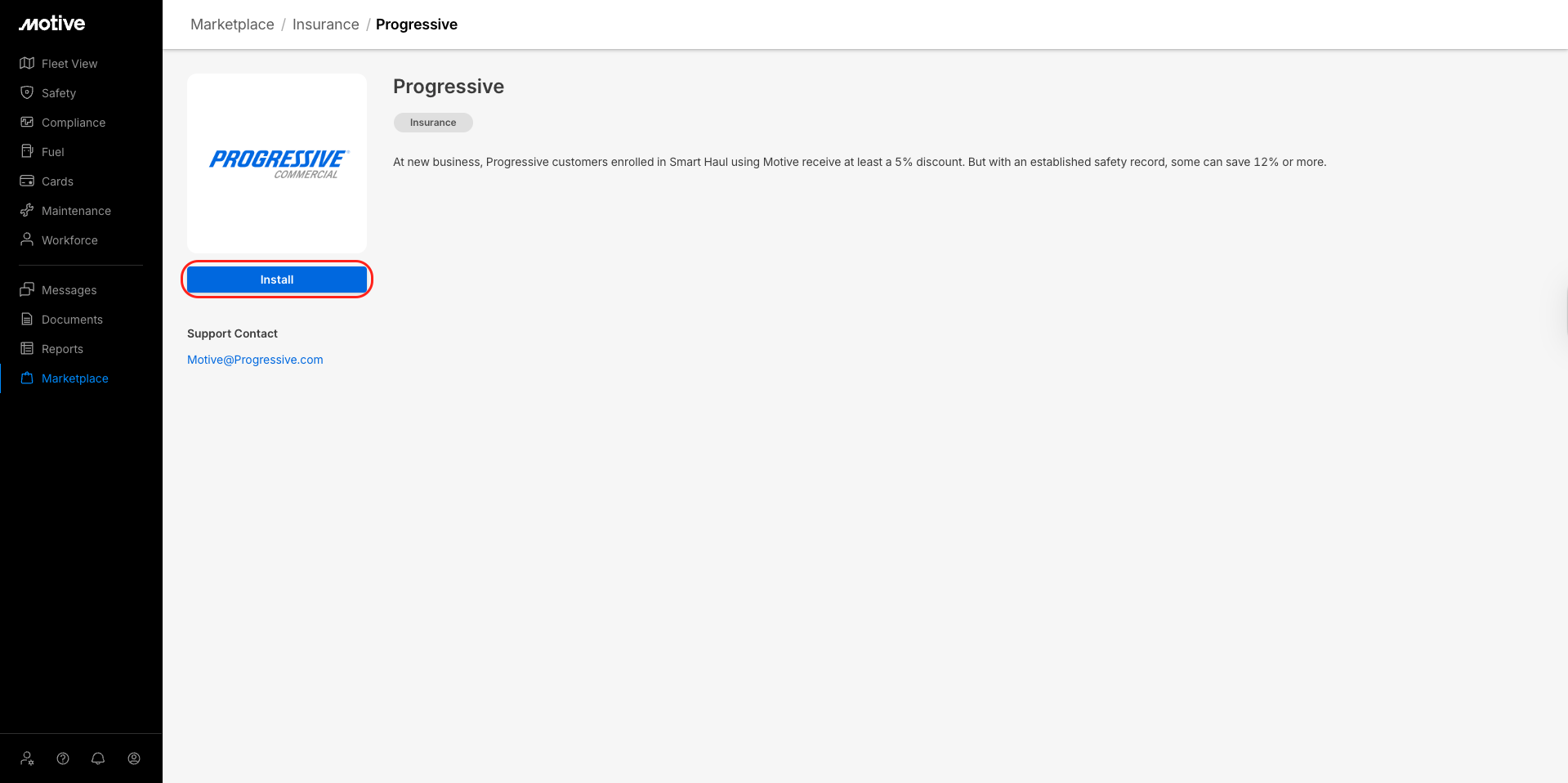 | Note: Click the Install button on the Motive standalone marketplace. The integration process is triggered on Progressive's ends |