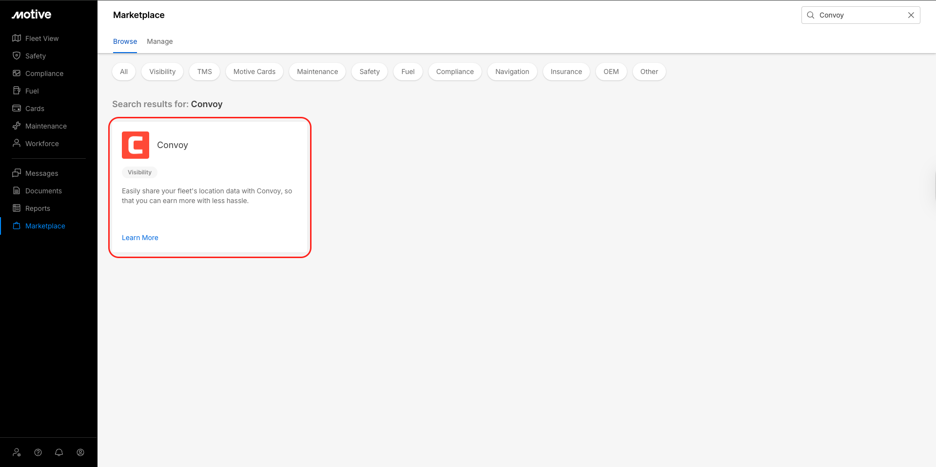 Log in to the Motive Fleet Dashboard and click Marketplace.