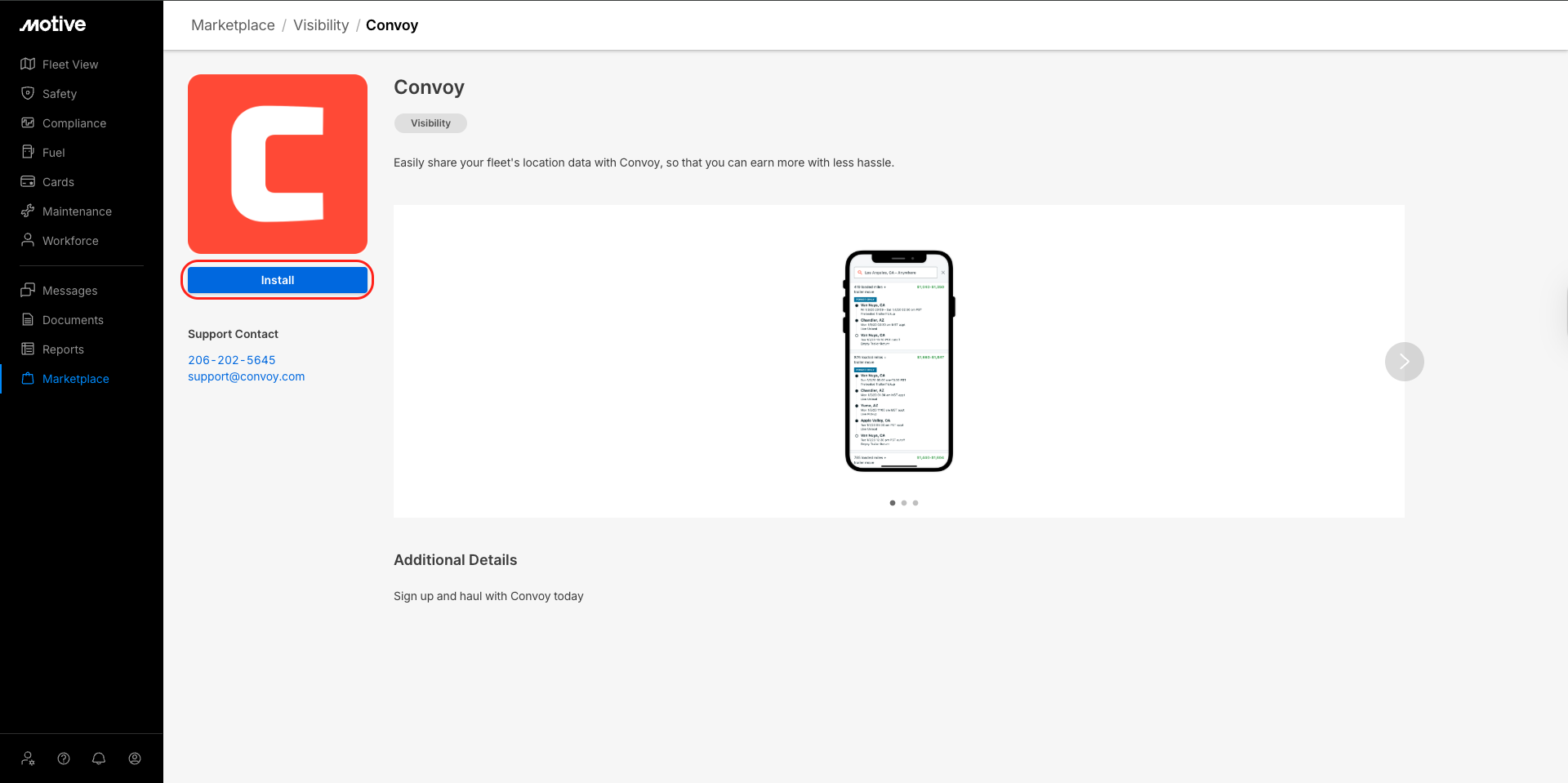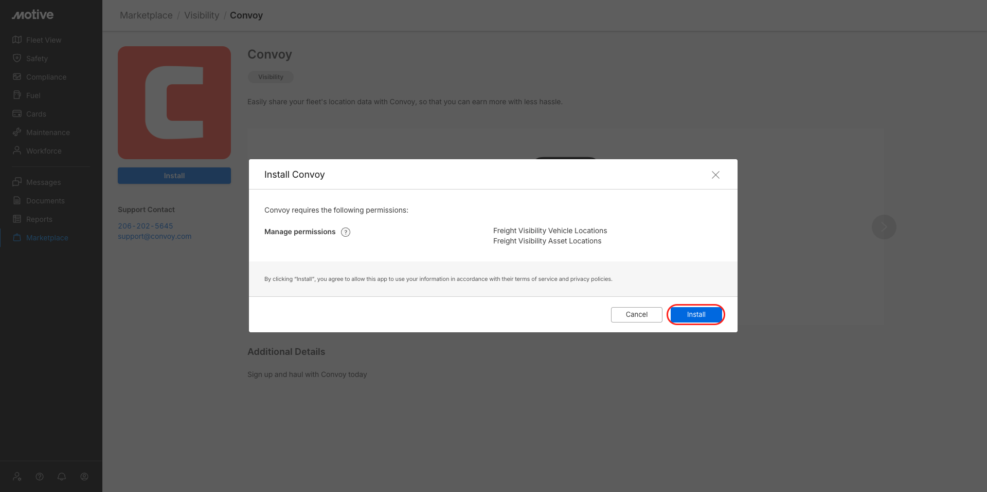 | Note: Click the Install button on the Motive standalone marketplace. The integration process is triggered on Convoy's ends |