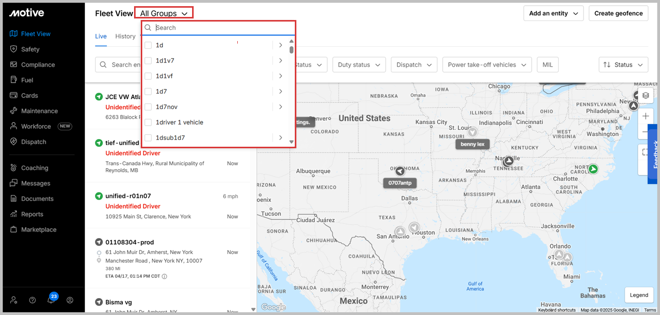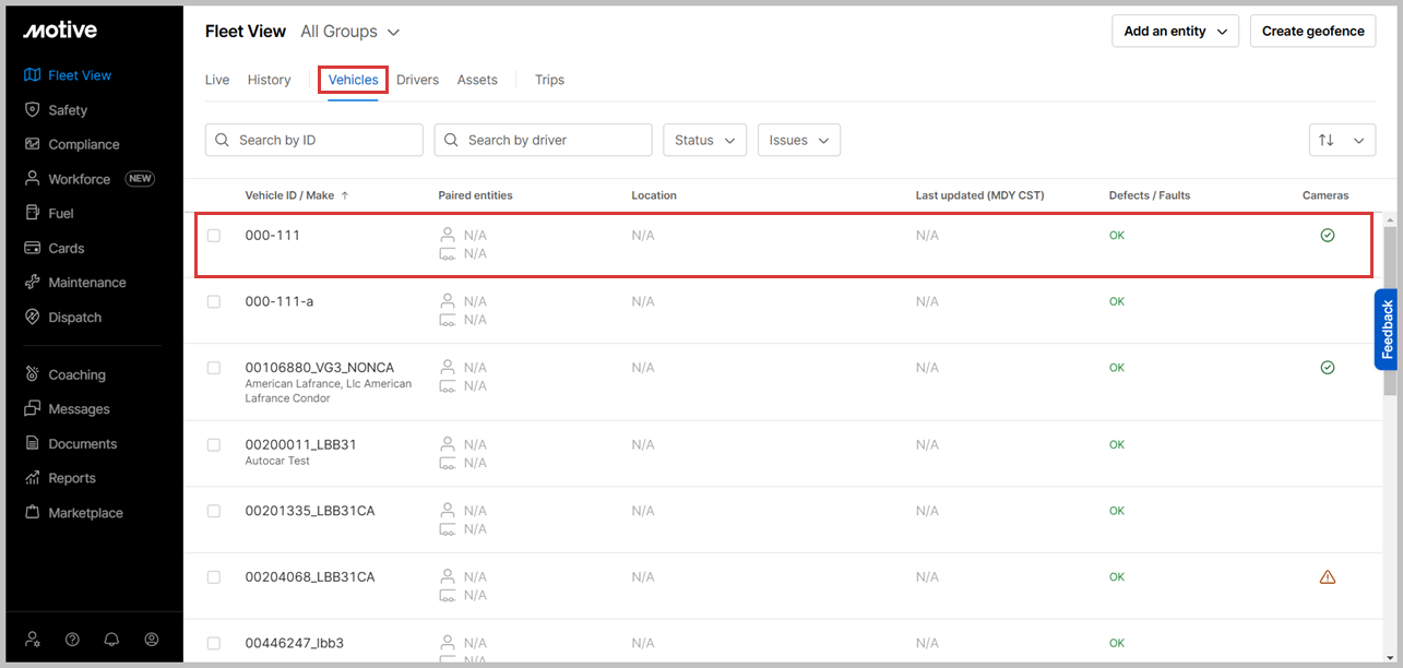 1. Log in to the Motive Fleet Dashboard. The Fleet View displays. Select a vehicle using the search bar, and other filters.