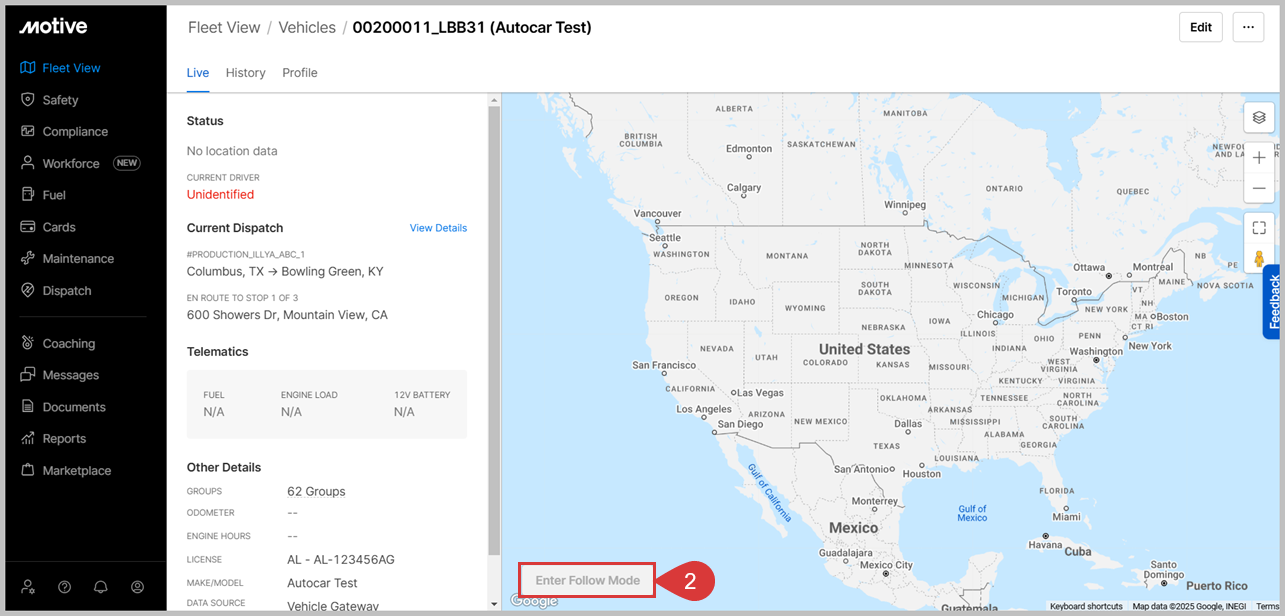 Currently, this option is only available for fleets with more than 20 Vehicle Gateways on their account with Motive. For fleets who are not enabled to use the ELD product, the Follow Mode button does not display. The map style in this case defaults to user preference. |