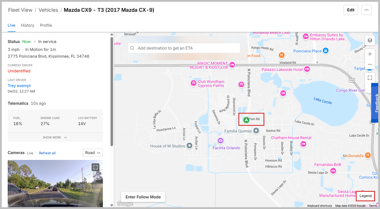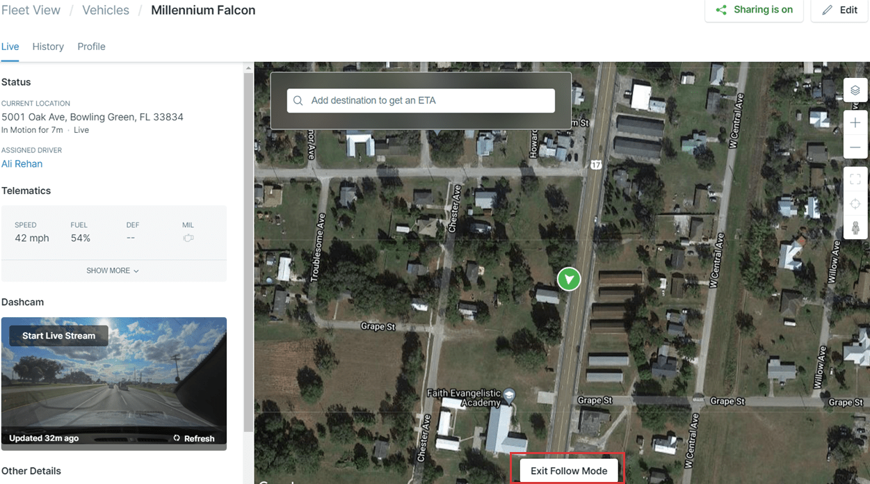 - Vehicles Live View: This detailed view shows information regarding the status of your vehicle, location data, current Driver, telematics, Smart Dashcam footage, and live map view.