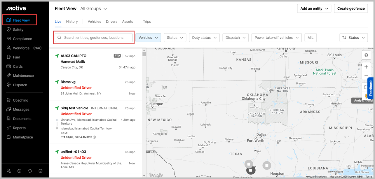 - Search: Locate vehicles, drivers, assets, geofences, or locations.