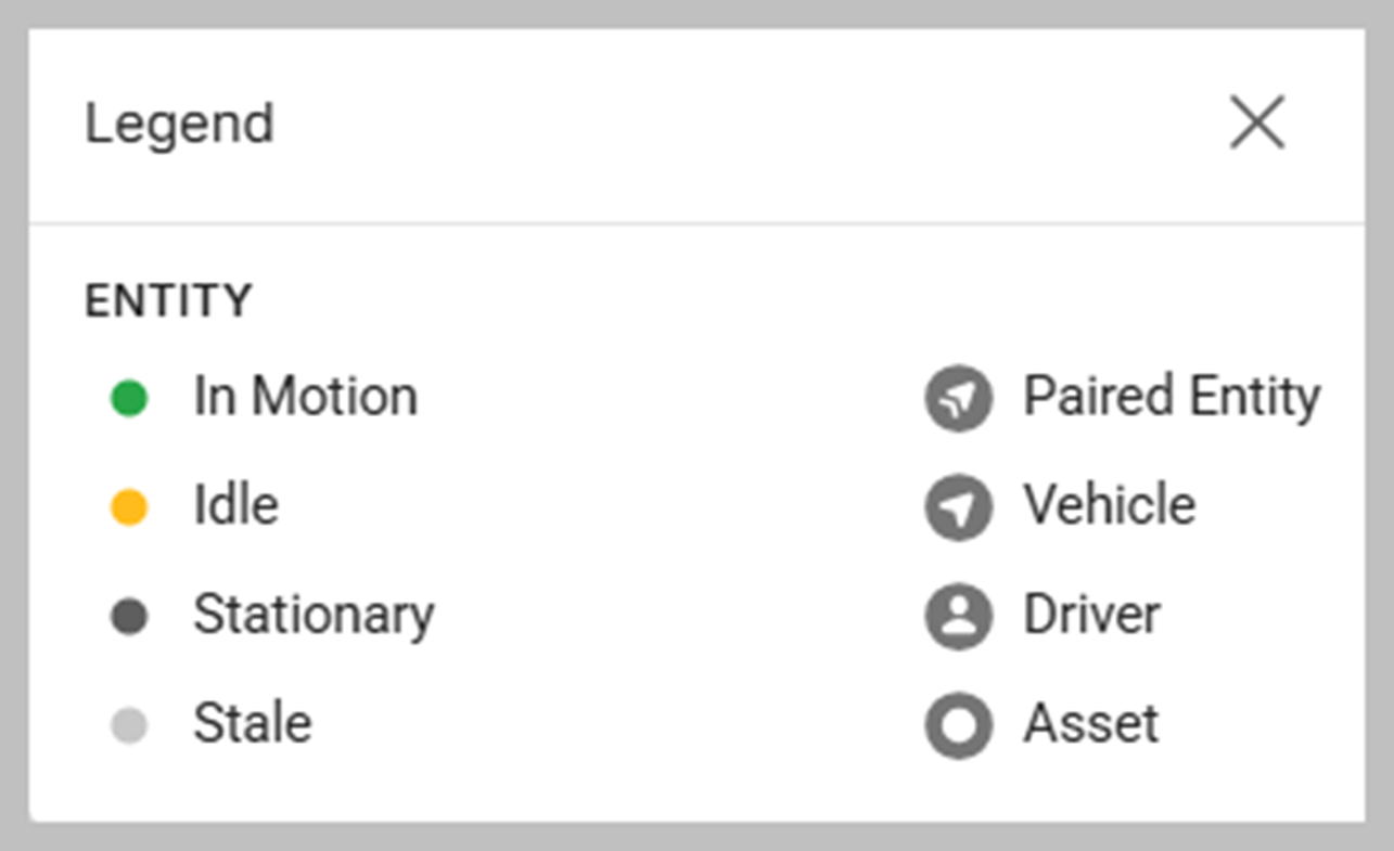 Icons indicate if an entity is in motion, idle, stationary, or if the data is stale.