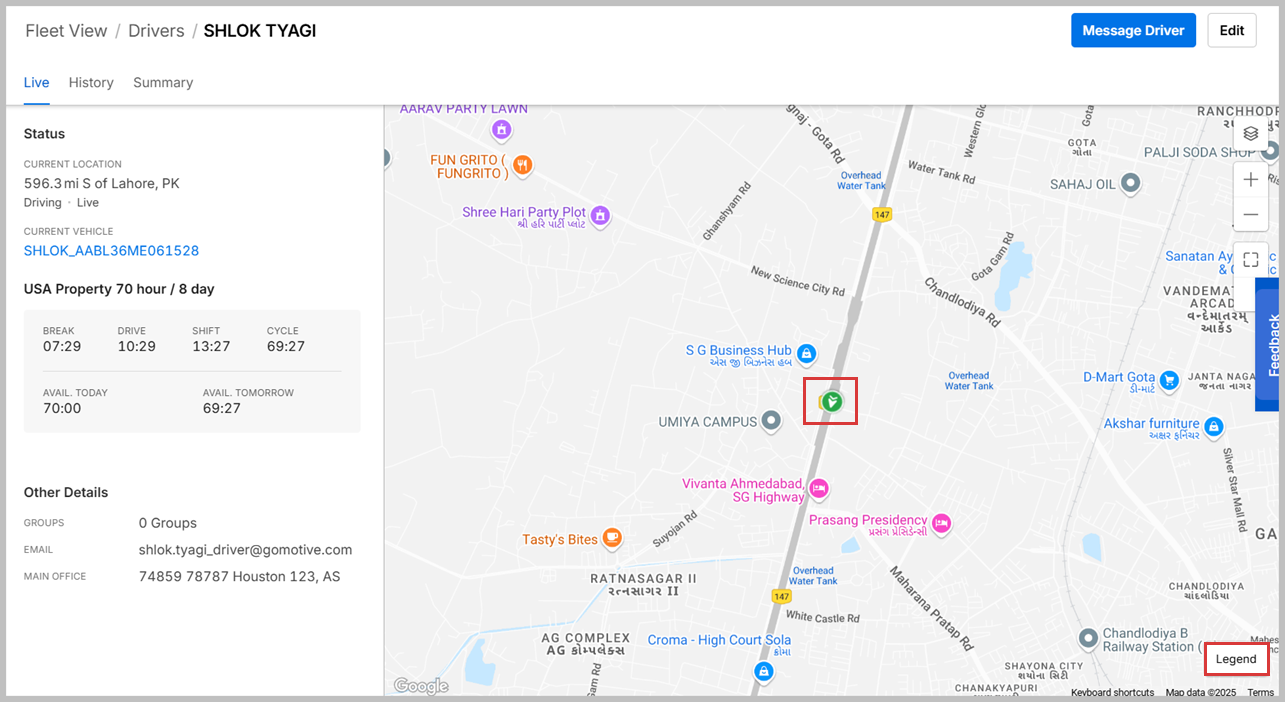 - Drivers Live View: This detailed view shows information regarding the status of your Driver, location data, current vehicle, hours of service, other details, and a live map view.