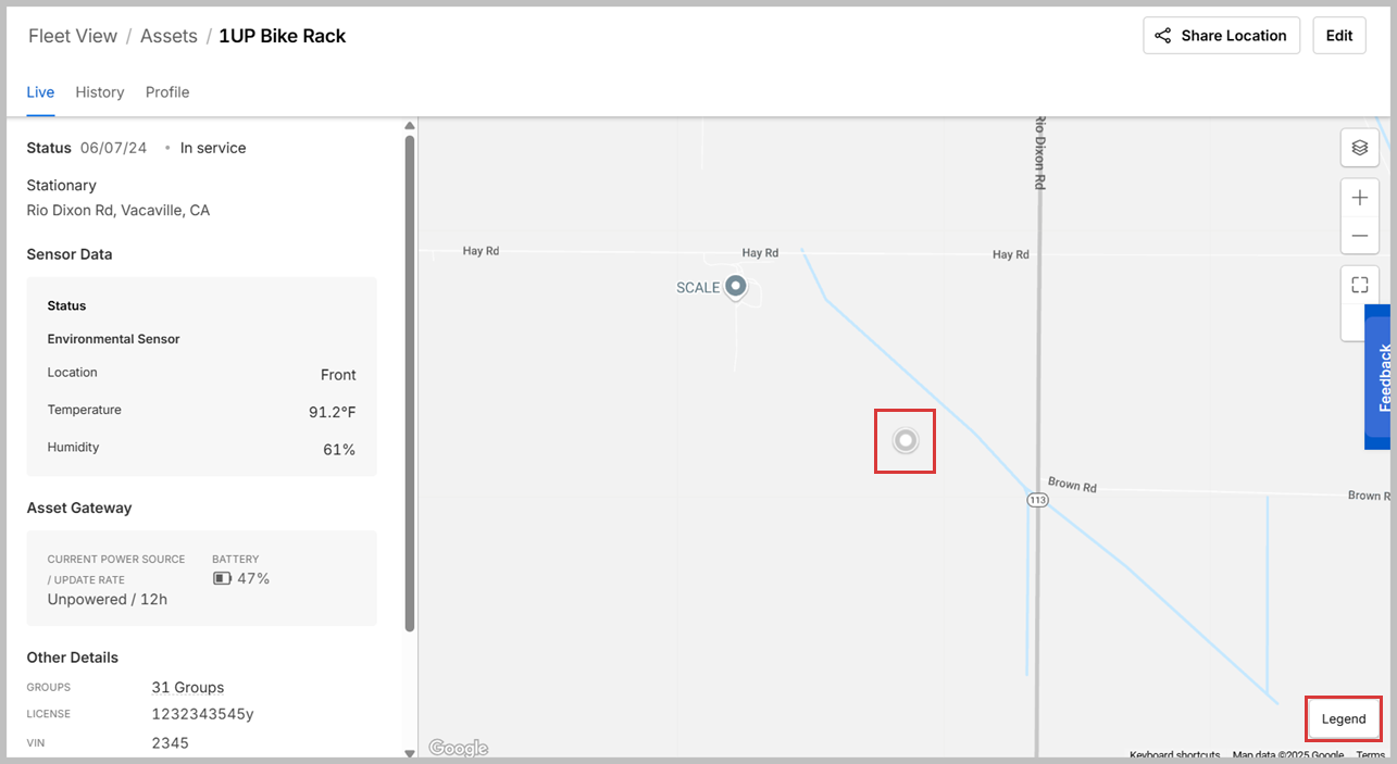- Assets Live View: This detailed view shows information regarding the status of your asset, location data, battery status, telematics, other details, and a live map view.