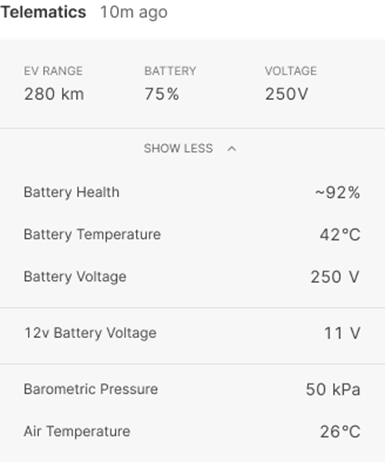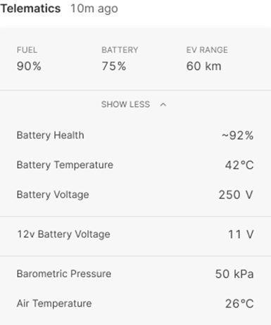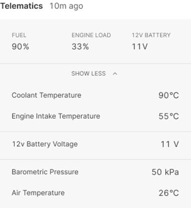 Under Telematics, your vehicle-related information, such as Fuel, Engine Load etc., is displayed. For more detailed information, click Show More.