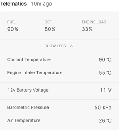 Fleet Admins and Fleet Managers can view Vehicle Telematics on the Fleet Dashboard when the Vehicle Gateway is connected and communicating with the vehicle's ECU. The Vehicle Telematics details include the remaining Fuel in the primary tank and values for Coolant, Engine Intake, and Speed in real time.