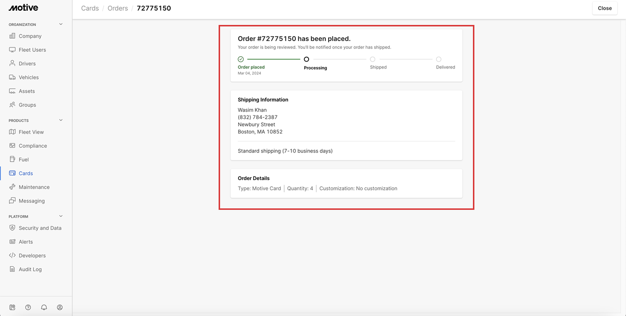 Fleet admins can order additional Motive Cards and track order status directly in the Motive Dashboard. Managing card inventory ensures drivers have the spending tools they need without delay.