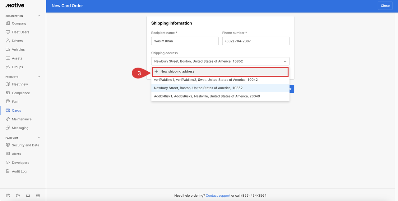 1. During the process of ordering a new physical card, a dropdown menu displays a list of verified Shipping addresses. Fleet Admins have added these addresses previously to their application and card replacement requests.