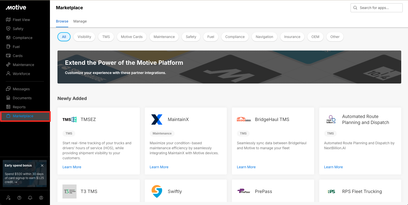Log in to the Motive Fleet Dashboard and click Marketplace.