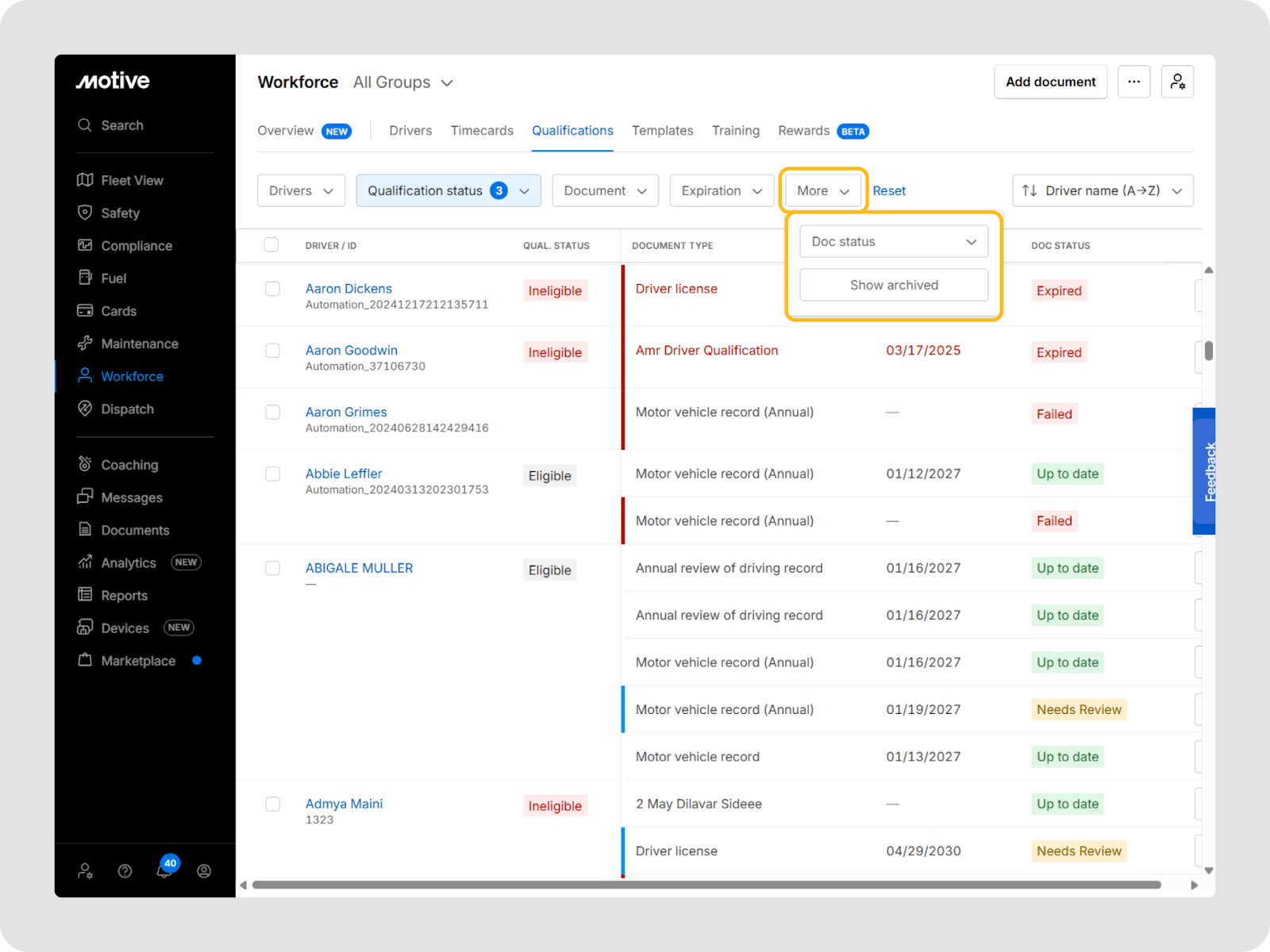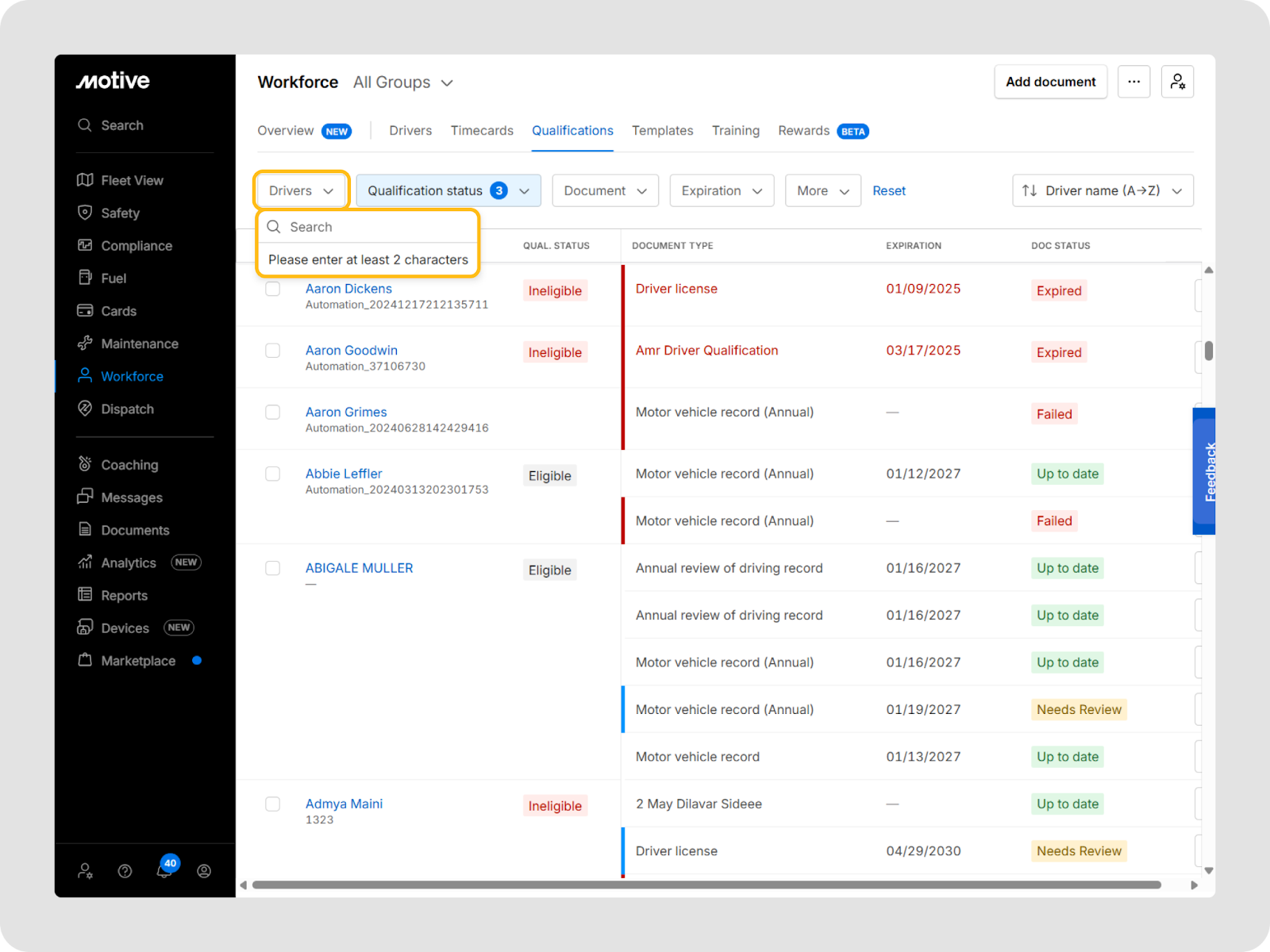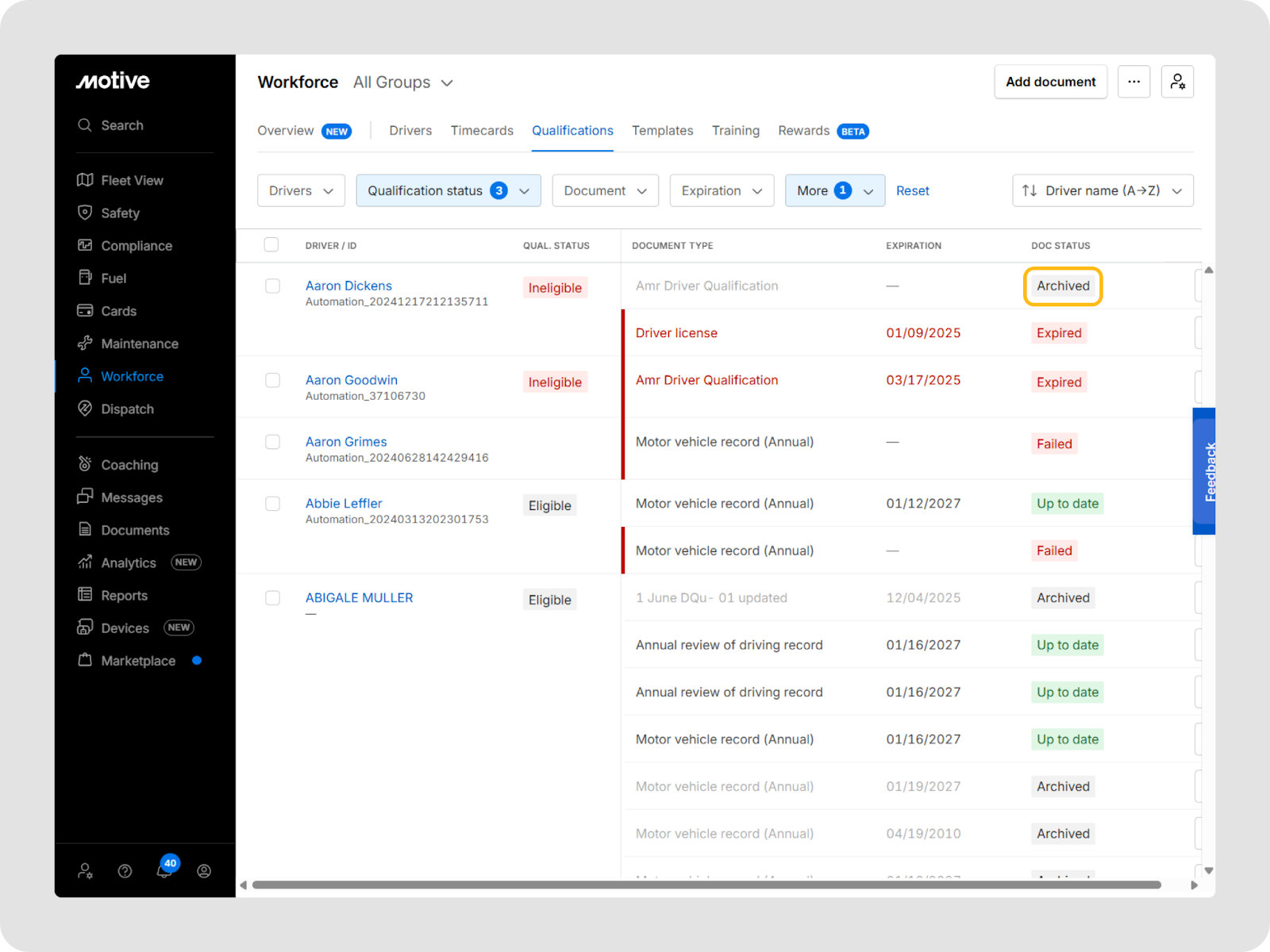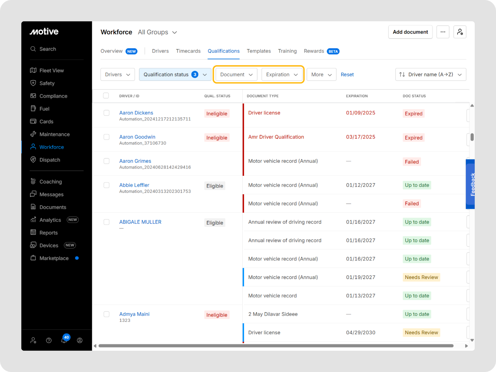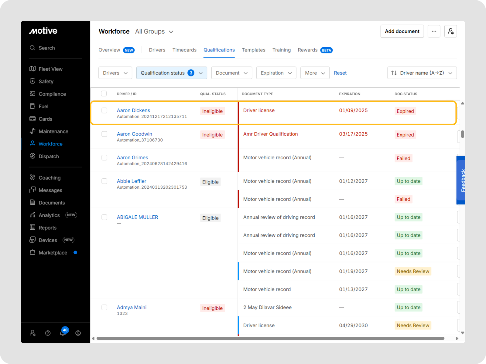 Managing qualification documents is essential for fleet compliance and safety. Motive’s Fleet Dashboard provides a centralized location for accessing, organizing, and controlling these documents, helping you maintain compliance while simplifying fleet management.