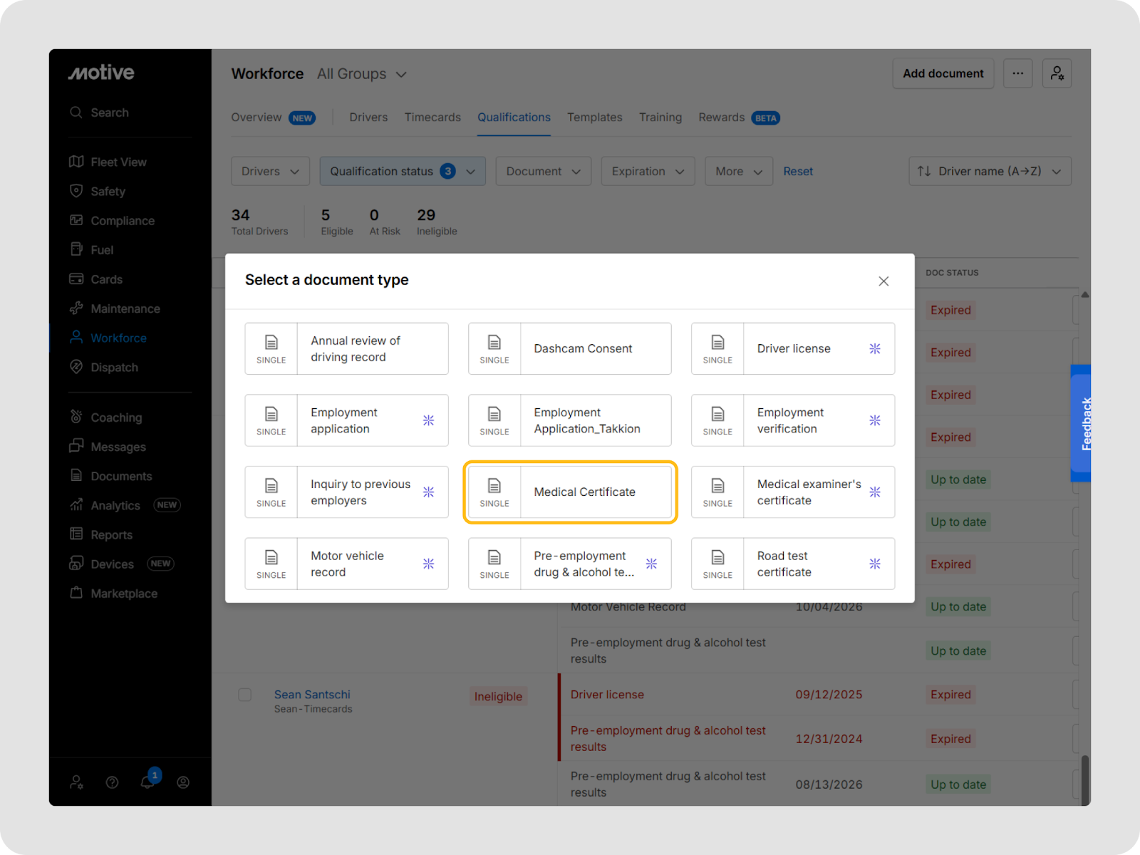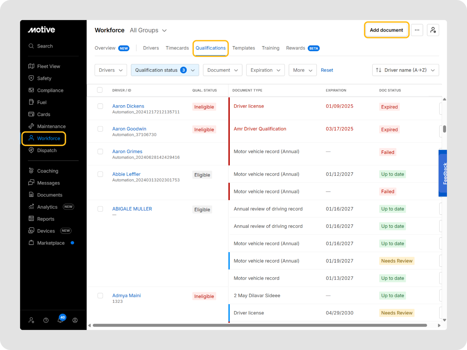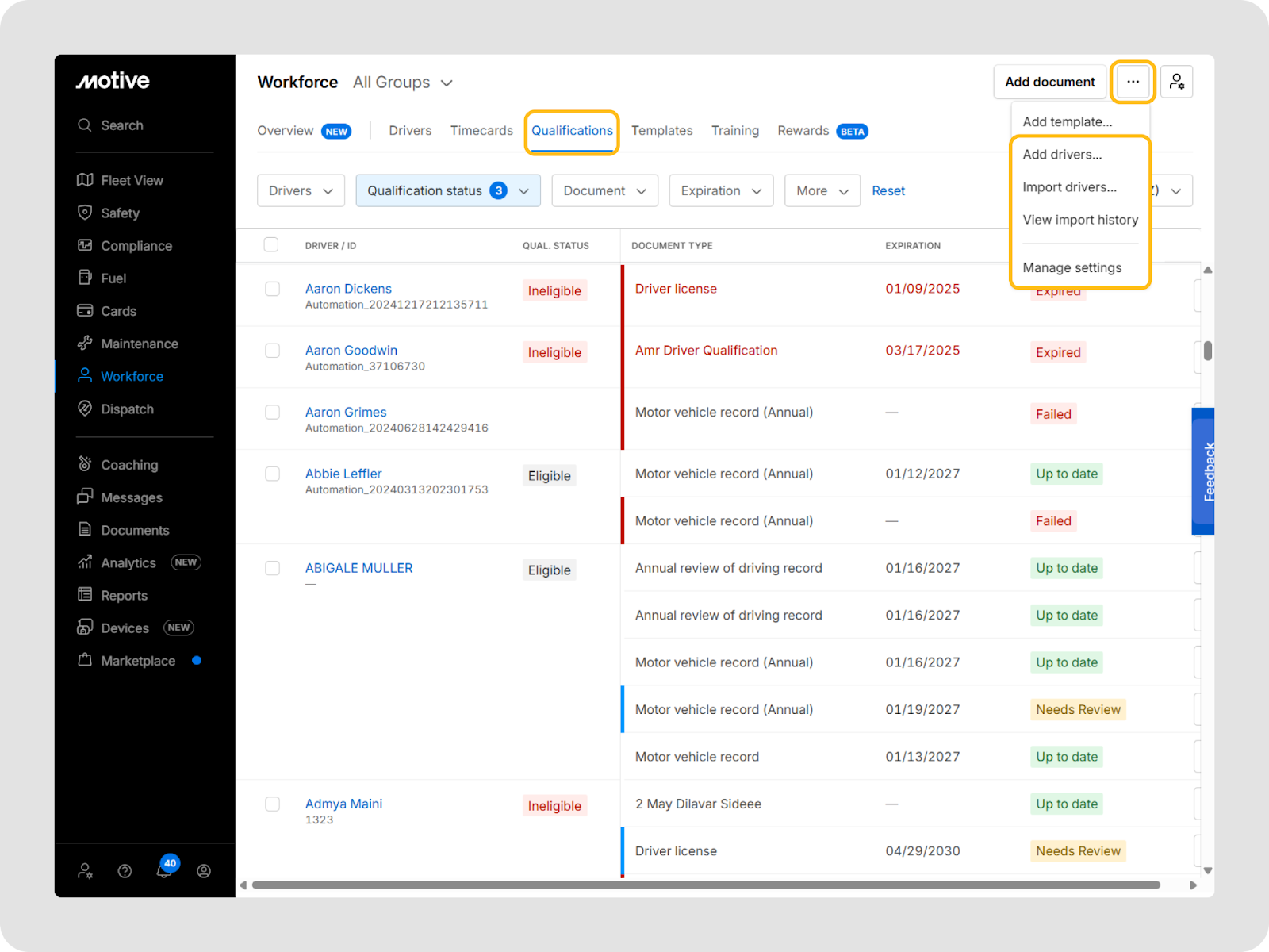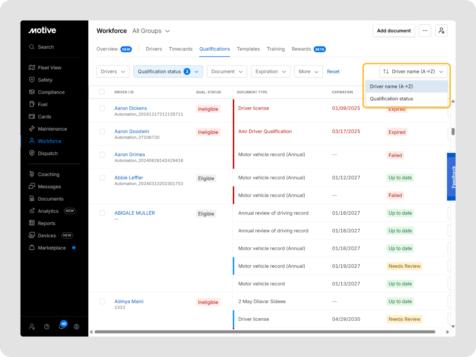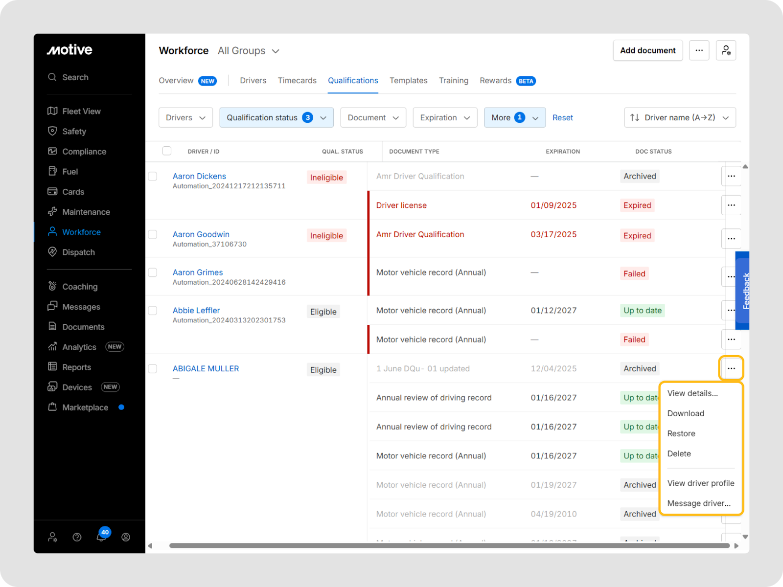 Managing qualification documents is essential for fleet compliance and safety. Motive’s Fleet Dashboard provides a centralized location for accessing, organizing, and controlling these documents, helping you maintain compliance while simplifying fleet management.