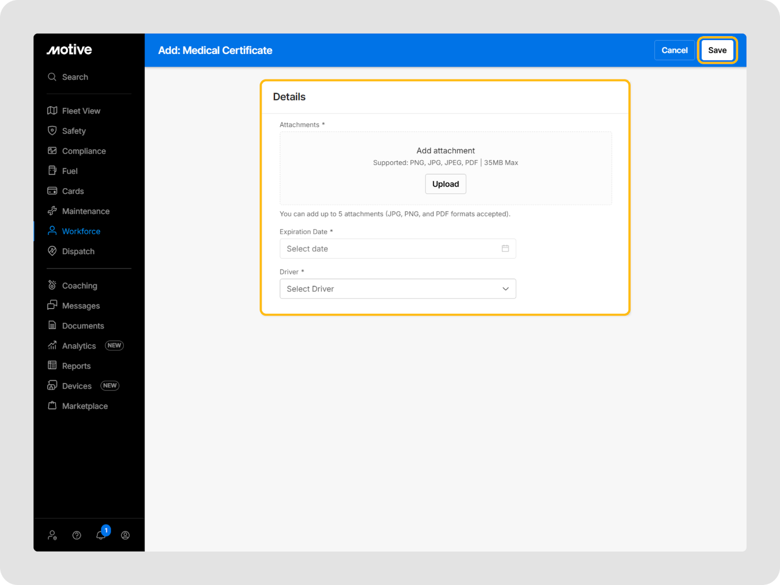 - Motive provides FMCSA-aligned templates for items such as driver's license, employment applications, medical examiner’s certificates, road test certificate, etc.