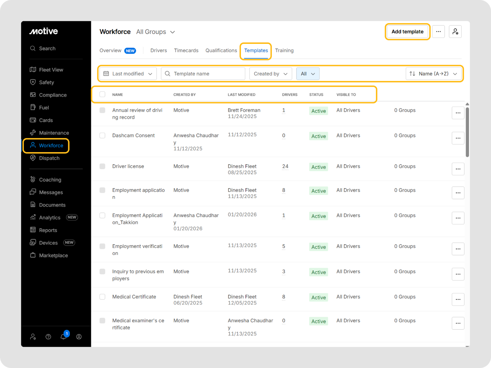 Motive provides FMCSA-aligned templates, which can be customized or used as-is. The following qualification templates are available by default: