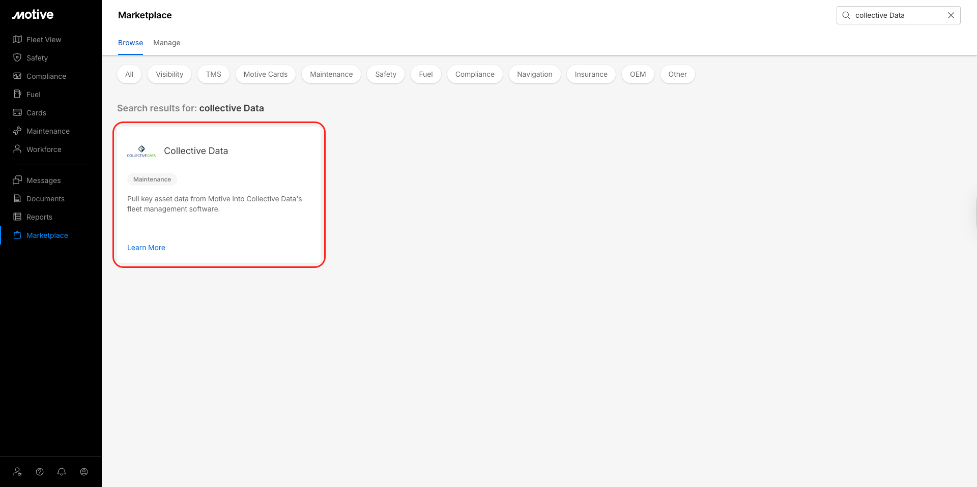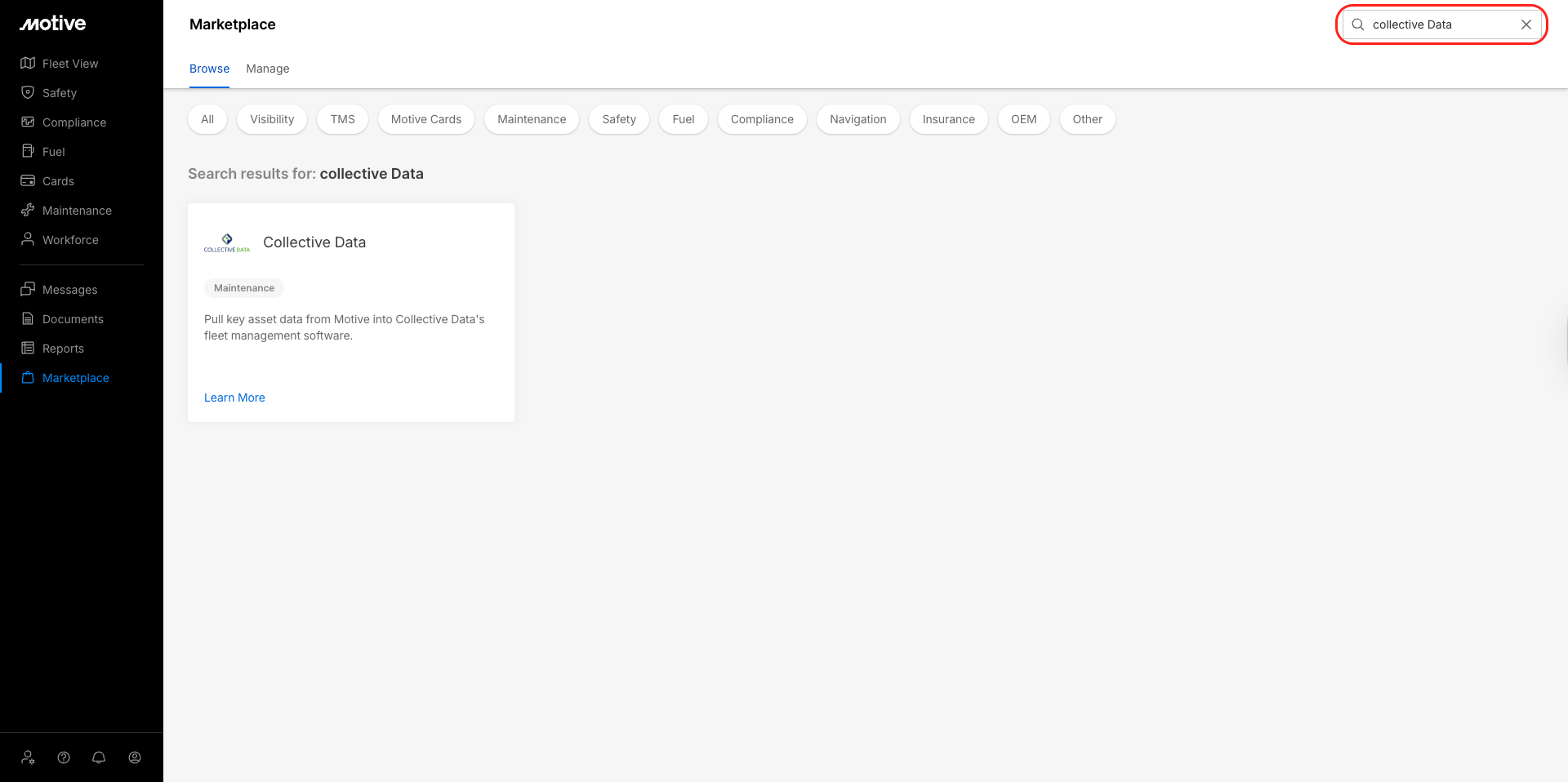 Log in to the Motive Fleet Dashboard and click Marketplace.