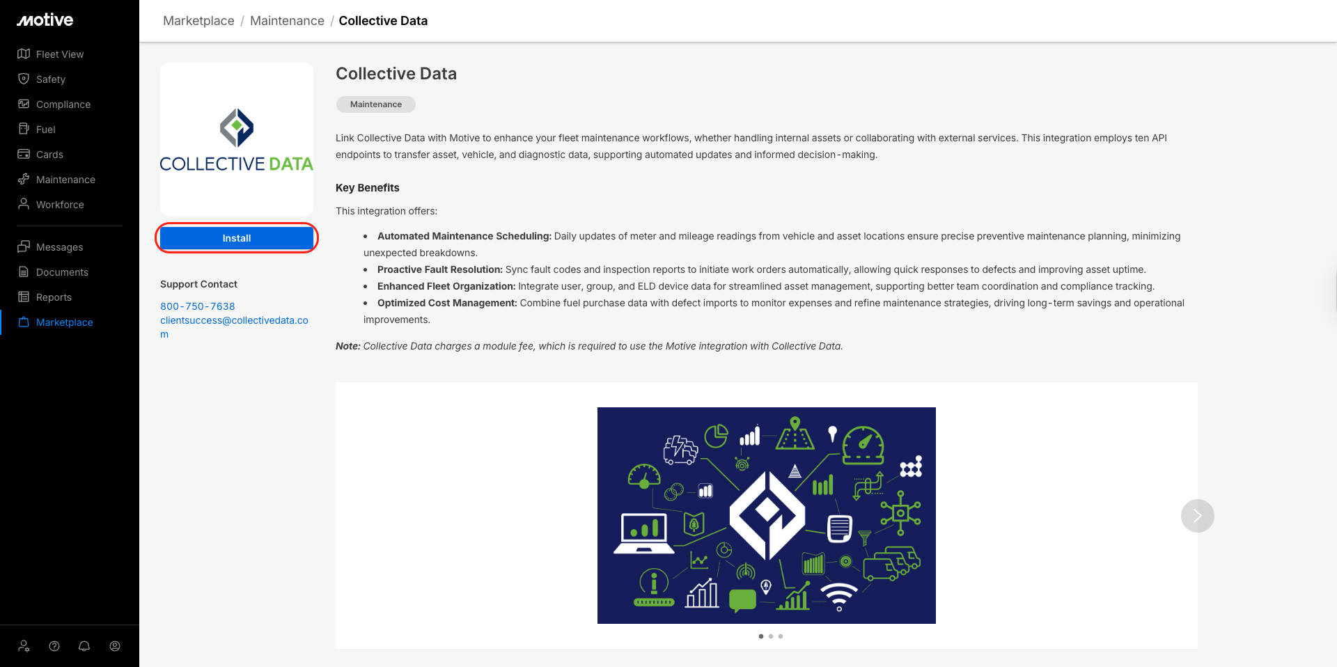 | Note: Click the Install button on the Motive standalone marketplace. The integration process is triggered on Collective Data’s ends |
