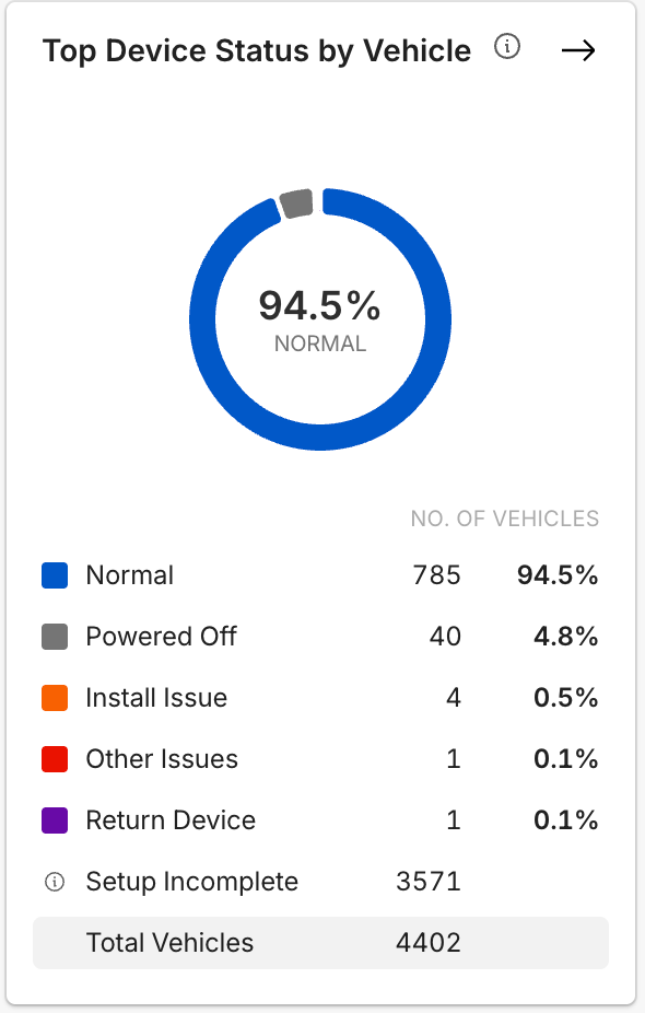 As a result, if one vehicle’s vehicle gateway is Normal but its dashcam is Powered Off, the Vehicle Chart will show that vehicle as Powered Off, while the Vehicle Gateway and Camera charts will count each device separately under their respective statuses.