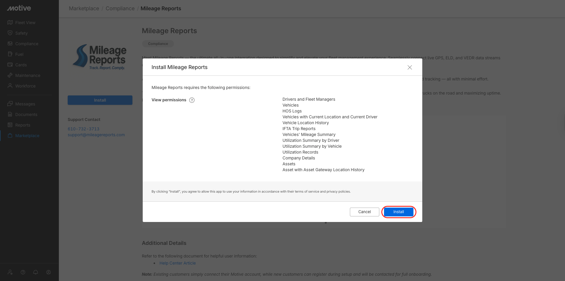 | Note: Click the Install button on the Motive standalone marketplace. The integration onboarding is done on Mileage Reports |