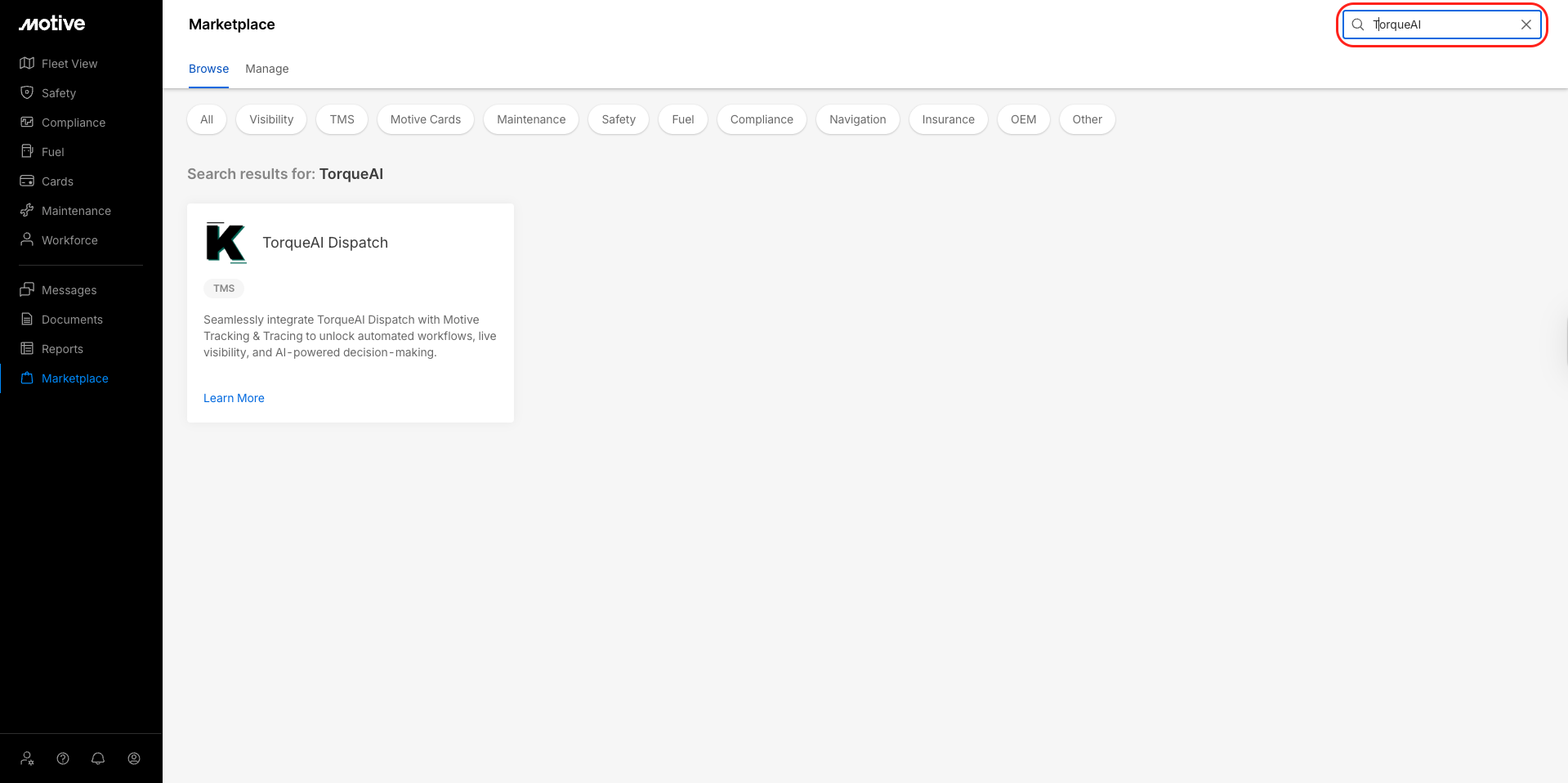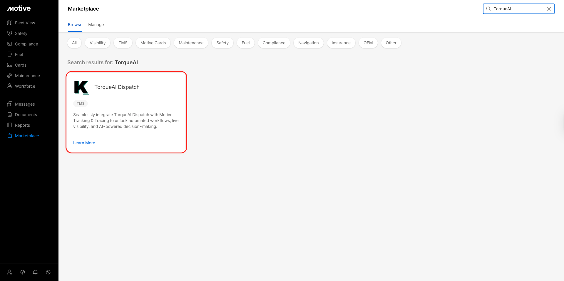 Locate TorqueAI Dispatch and click Learn More.