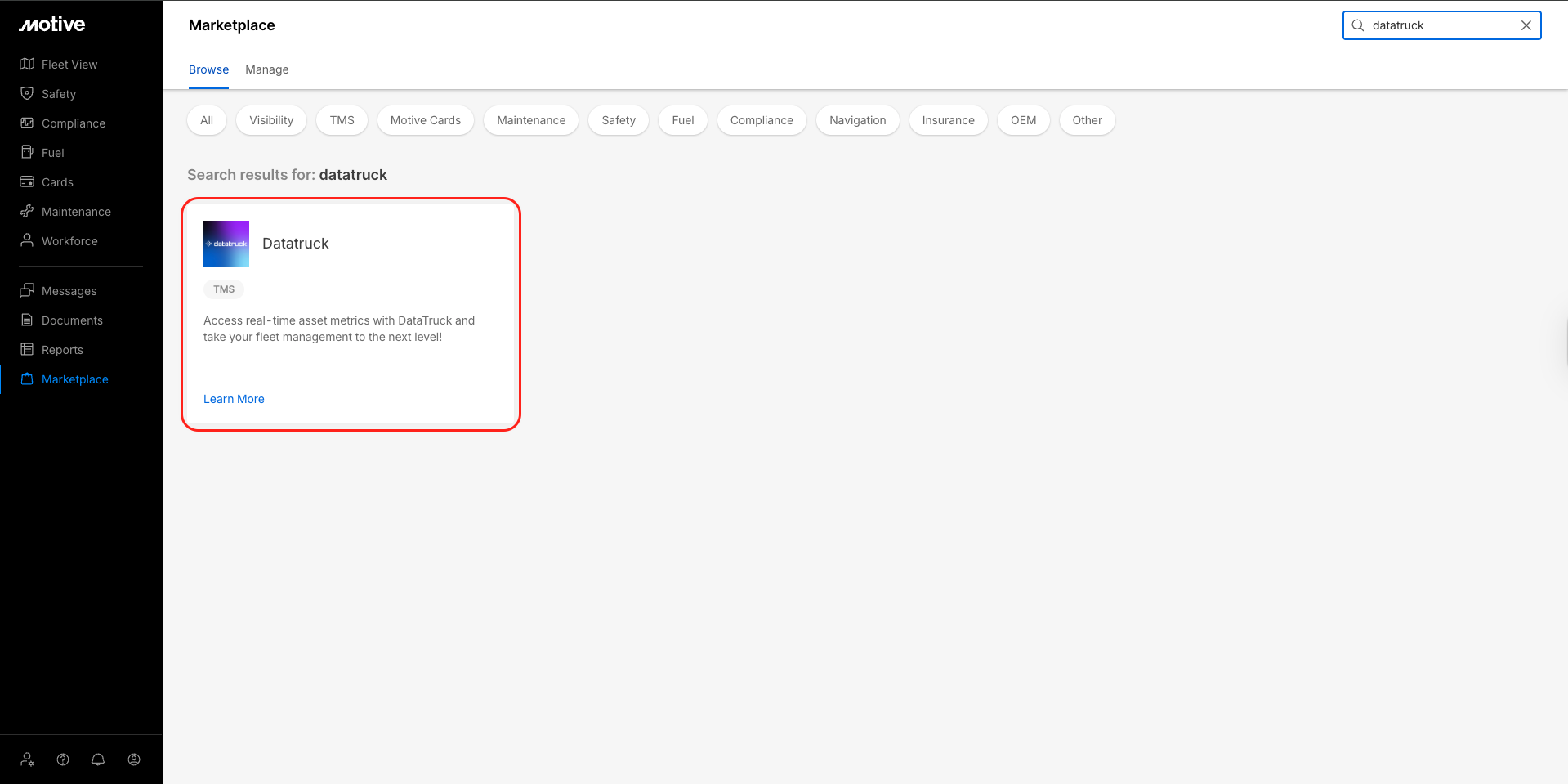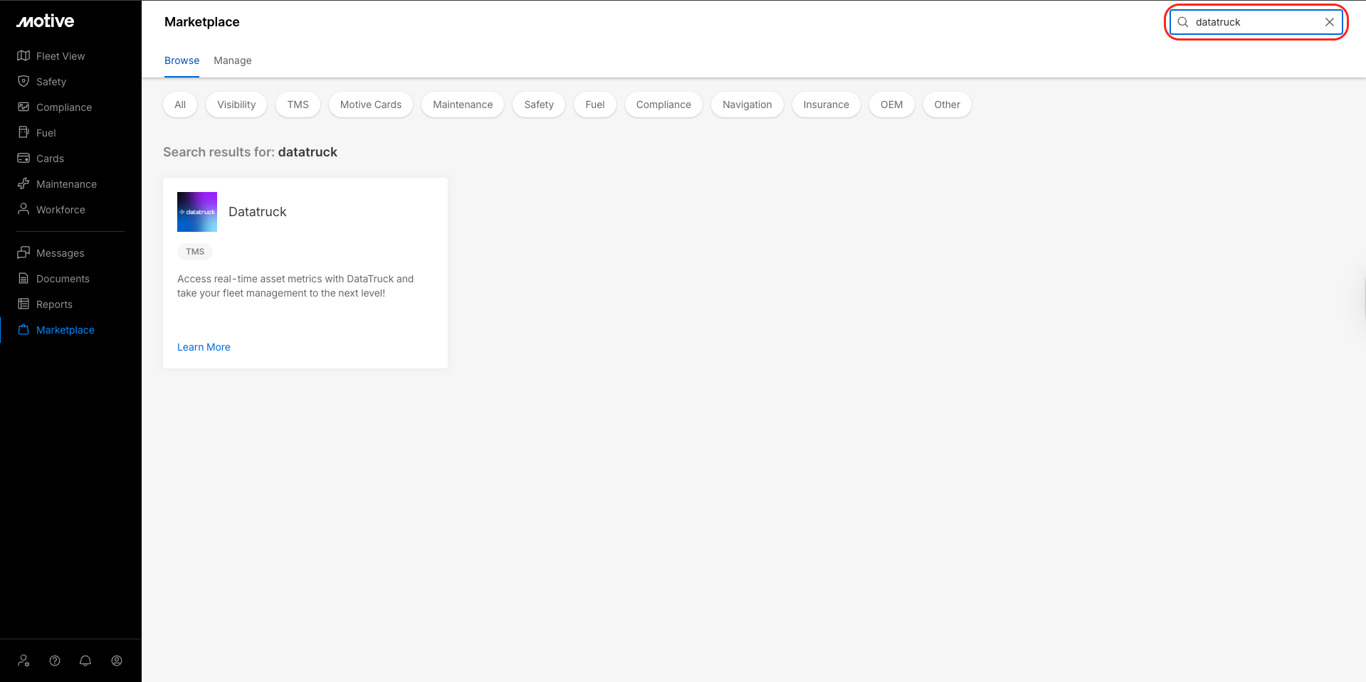 Log in to the Motive Fleet Dashboard and click Marketplace.