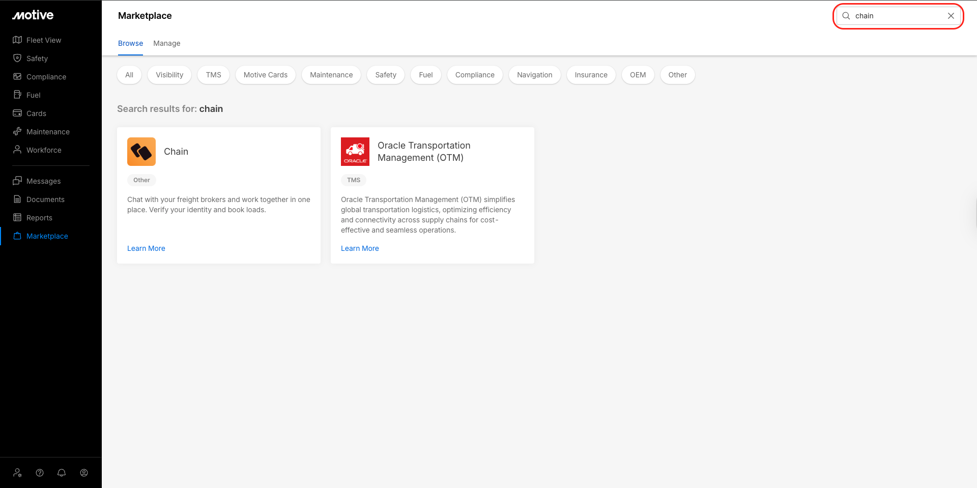 Log in to the Motive Fleet Dashboard and click Marketplace.