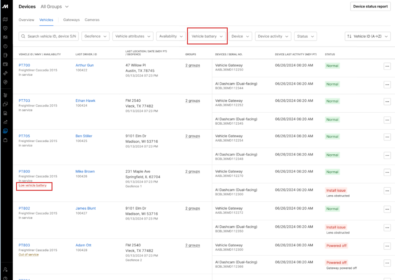 2. Use the Low Vehicle Battery filter to view vehicles with low battery status.