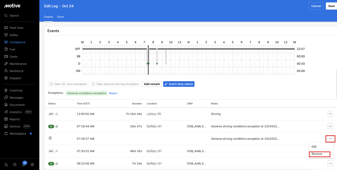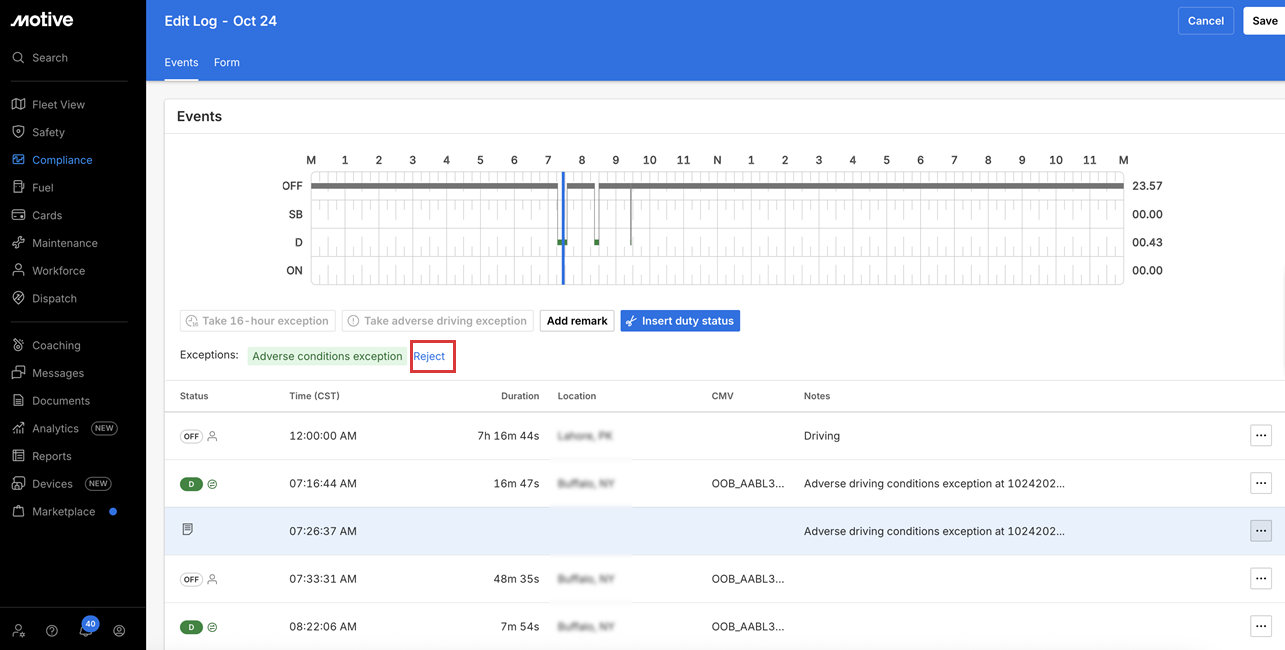 Motive Fleet Dashboard allows Fleet Managers and Fleet Admins to view when their fleets have adverse driving conditions exceptions applied to their following day’s logs.