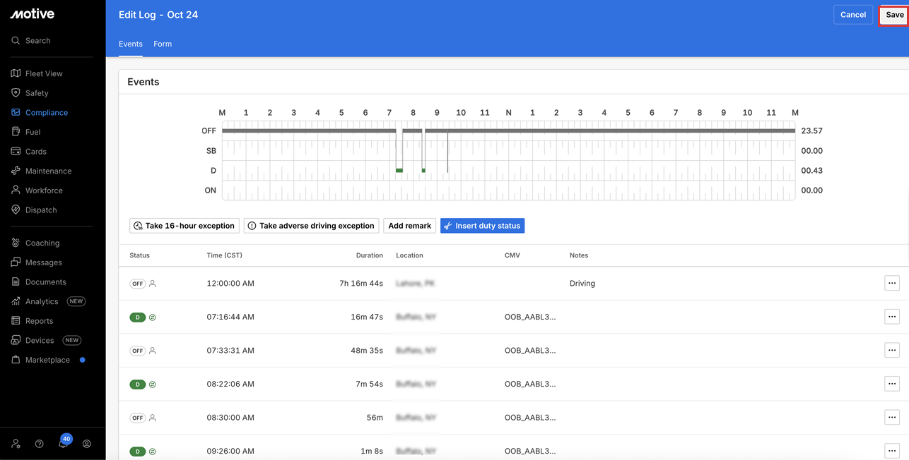 9. Click Save to apply the changes. Once saved, a log suggestion is sent to the driver for approval.