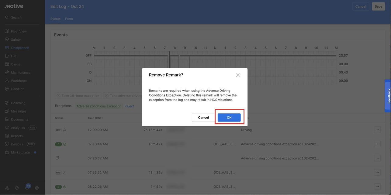 8. A pop-up appears for confirmation. Deleting this remark would remove the exception from the log and may result in HOS violations. Click OK.