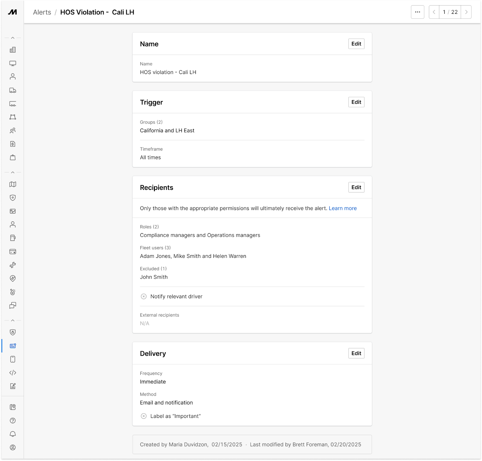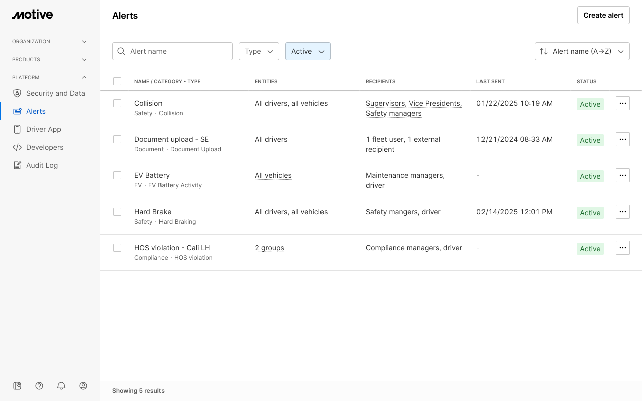 Any fleet user with the Manage Alerts permission can view and edit all alerts created in the Motive Dashboard.