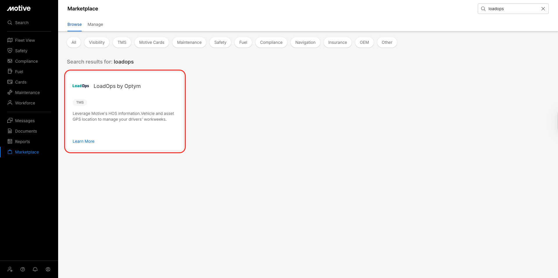 Log in to the Motive Fleet Dashboard and click Marketplace.