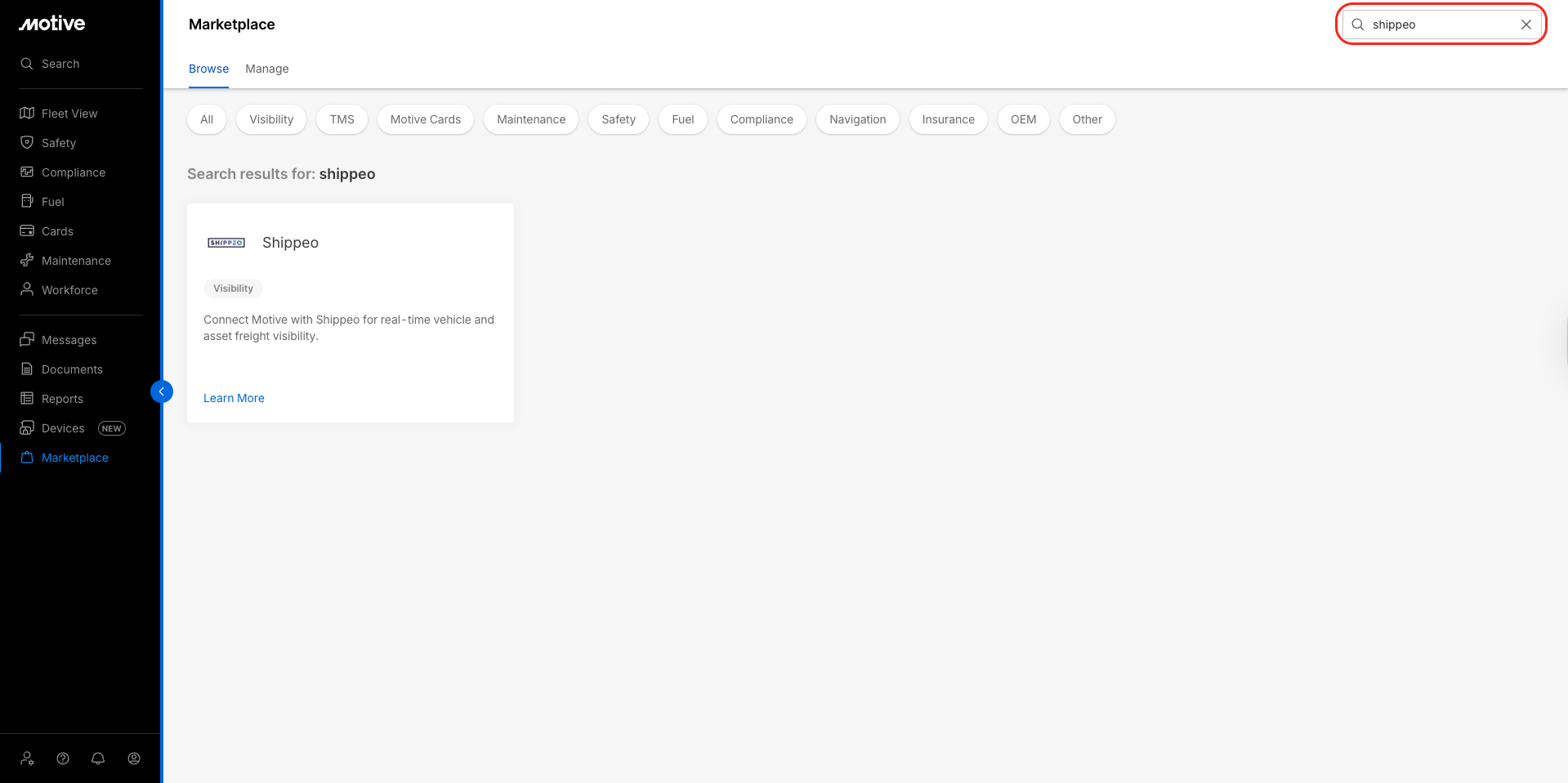 Log in to the Motive Fleet Dashboard and click Marketplace.