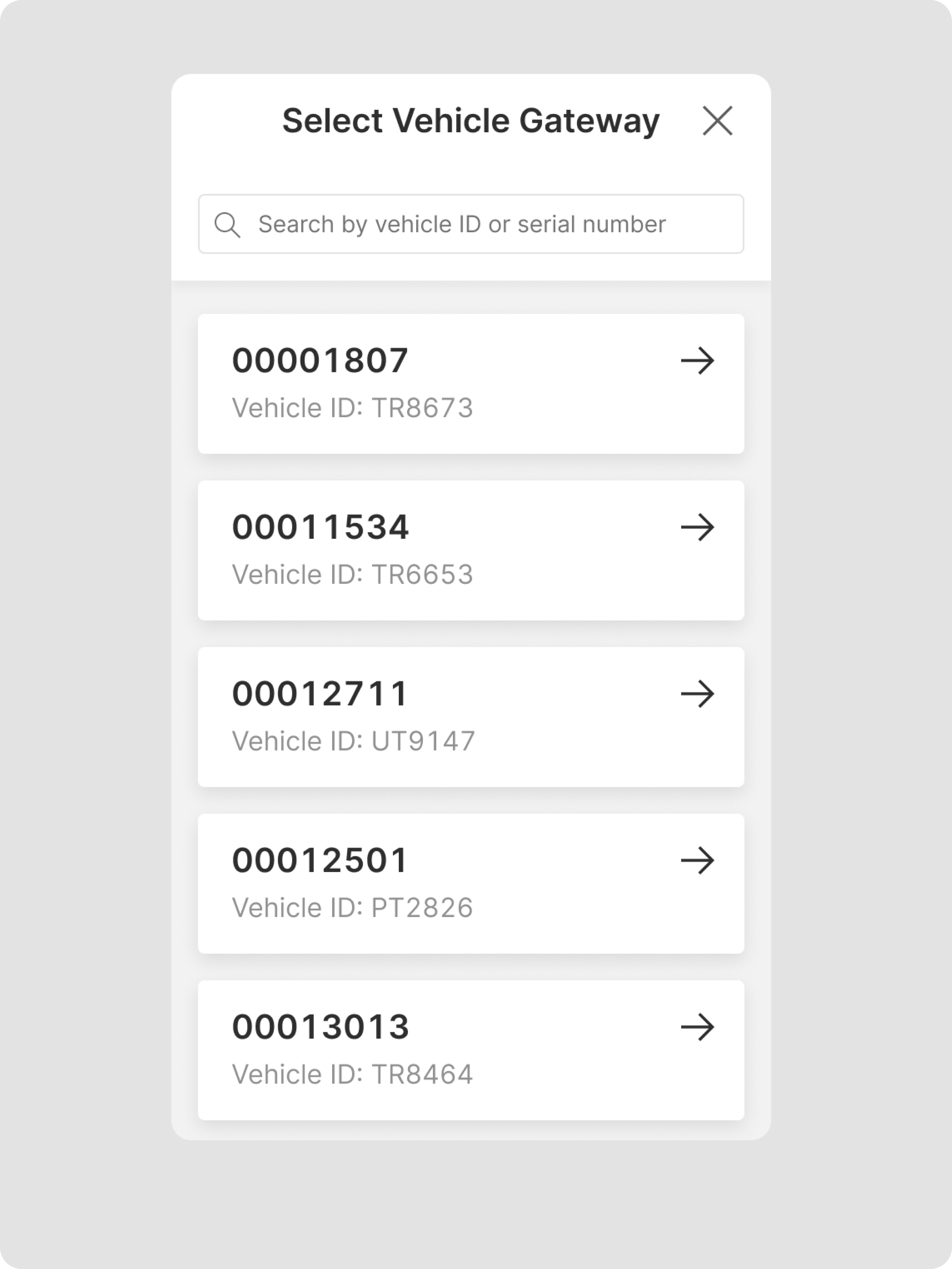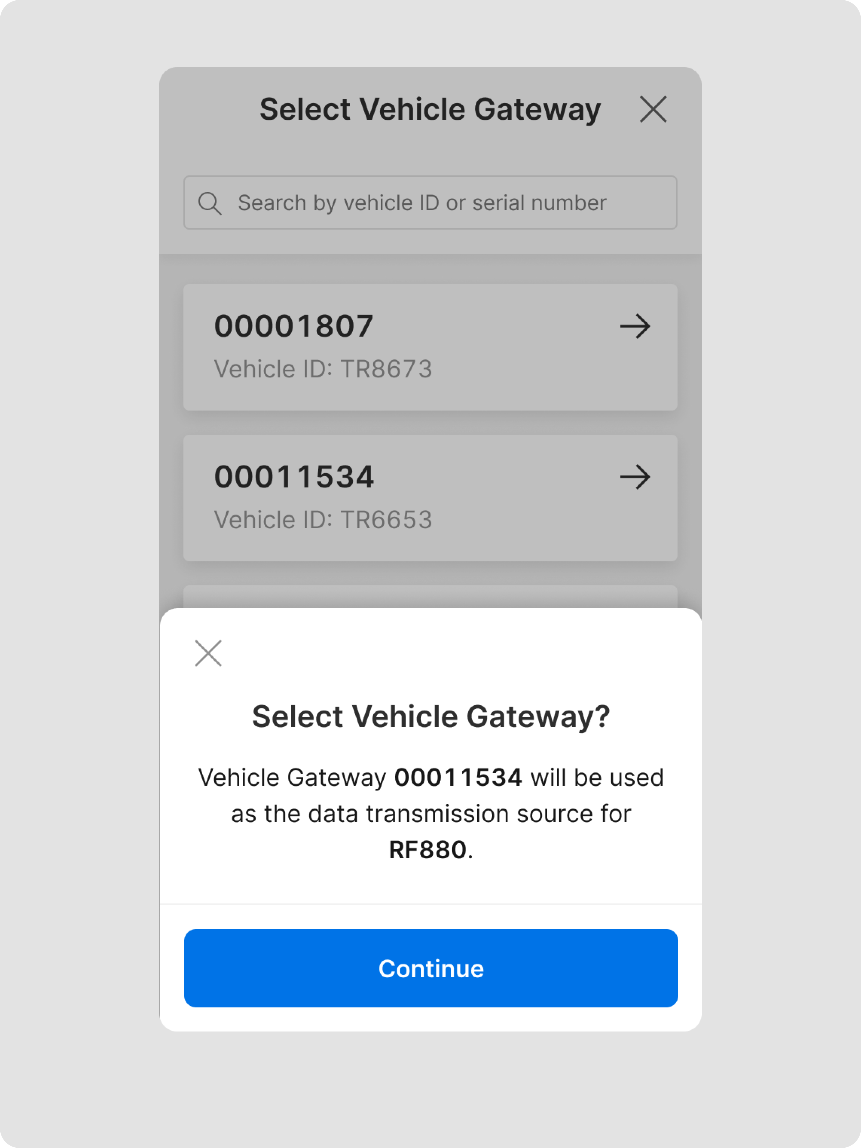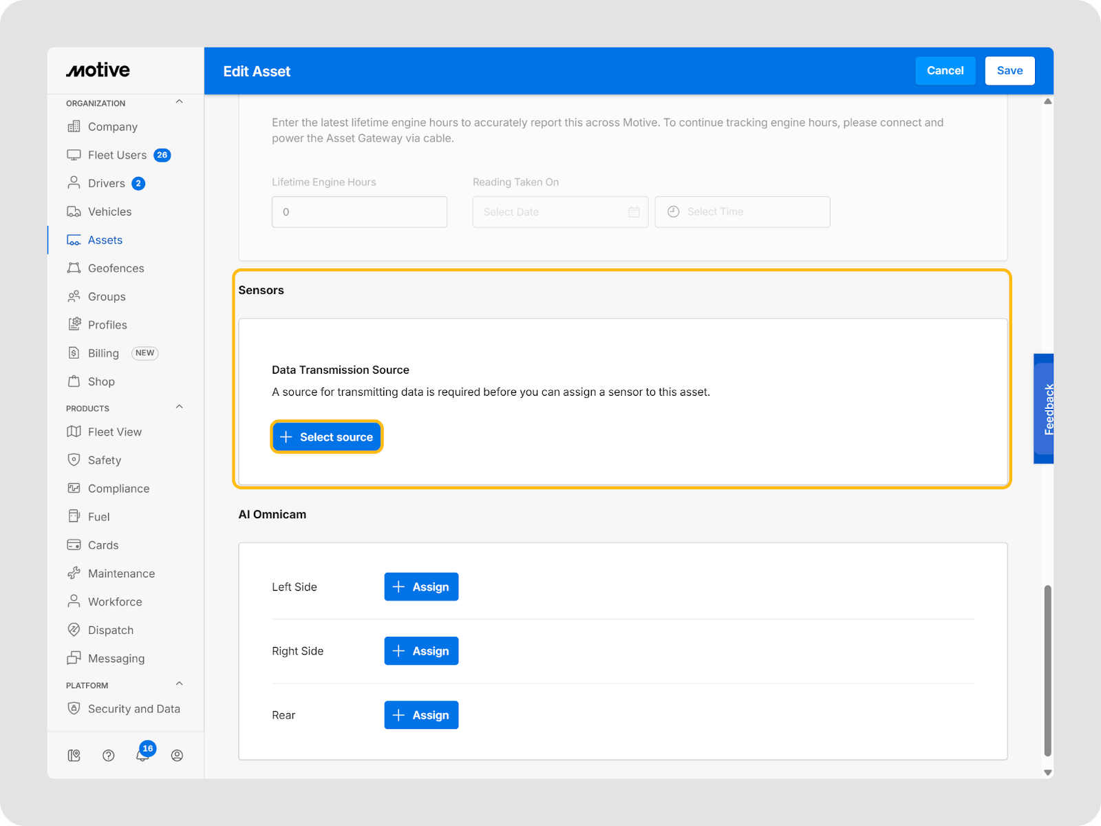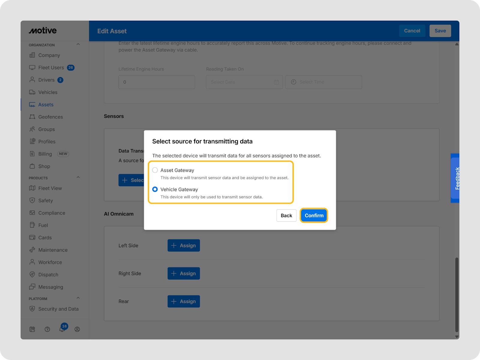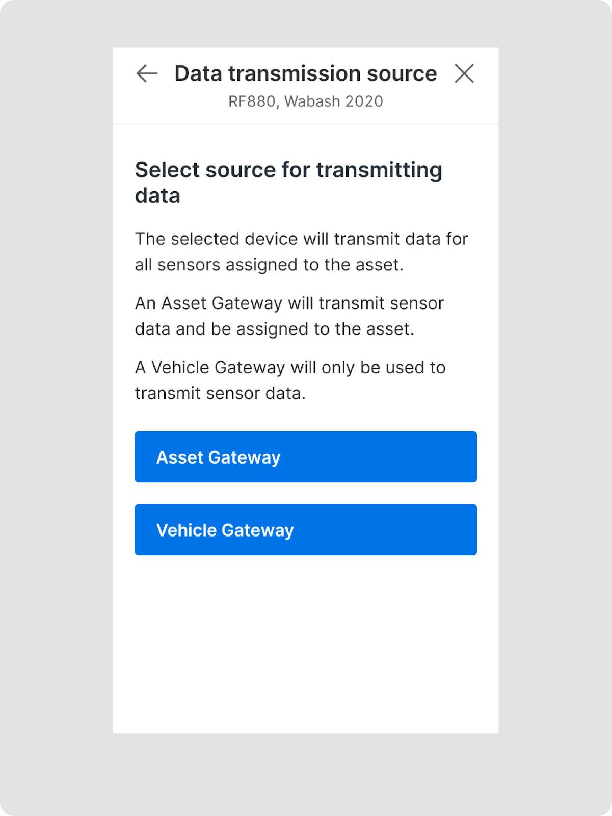 - Go to Sensors > Data Transmission Source > + Select source and select Vehicle Gateway. The selected device will transmit data for all sensors assigned to the asset.