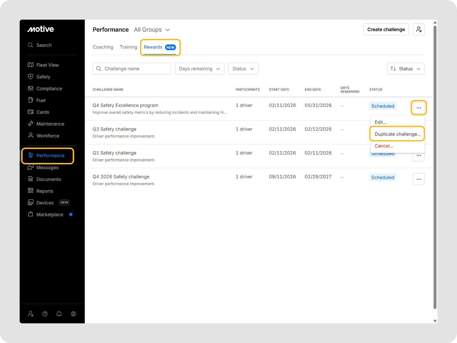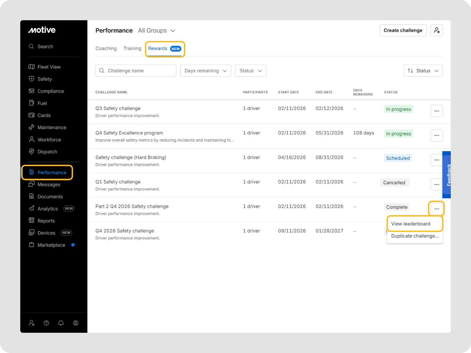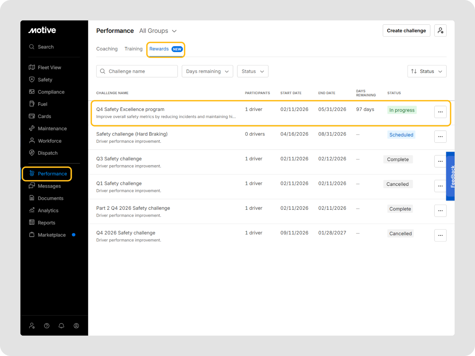 You can go to Performance > Rewards in the Motive Fleet Dashboard to view and manage all challenges.