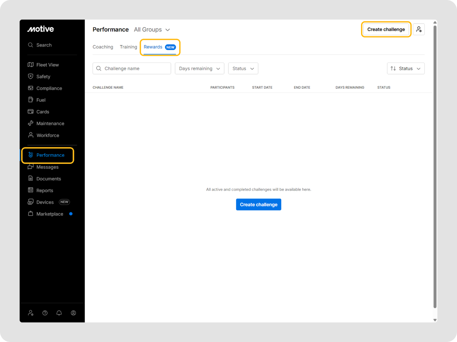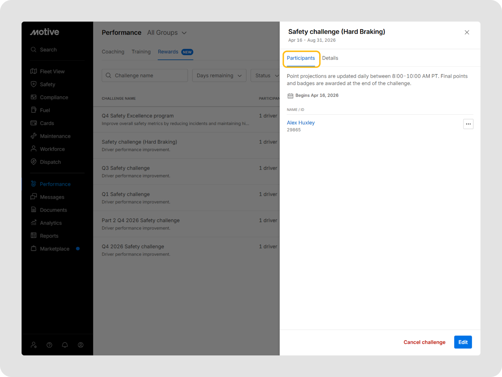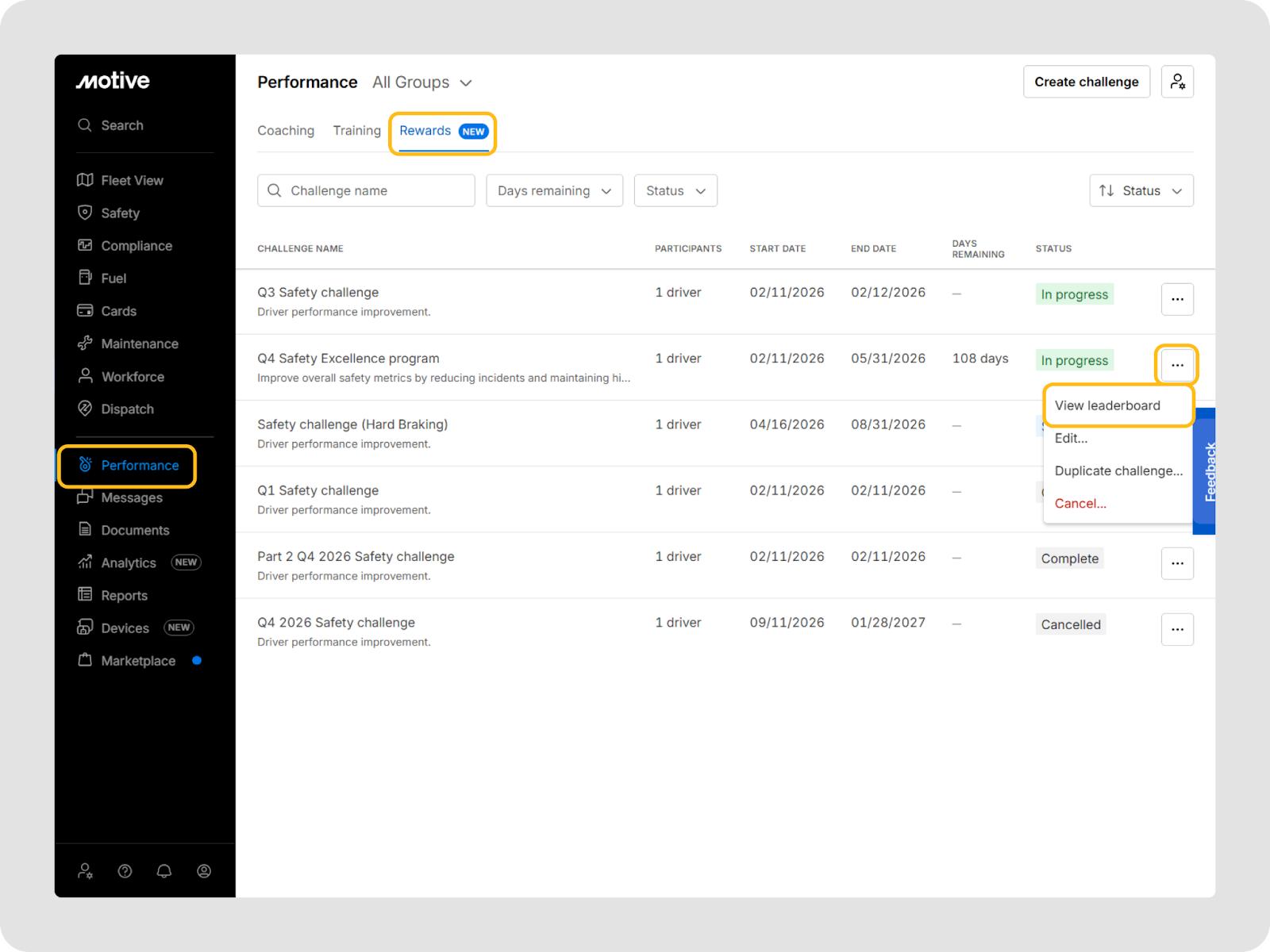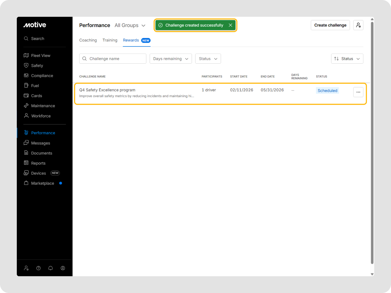 You can go to Performance > Rewards in the Motive Fleet Dashboard to view and manage all challenges.