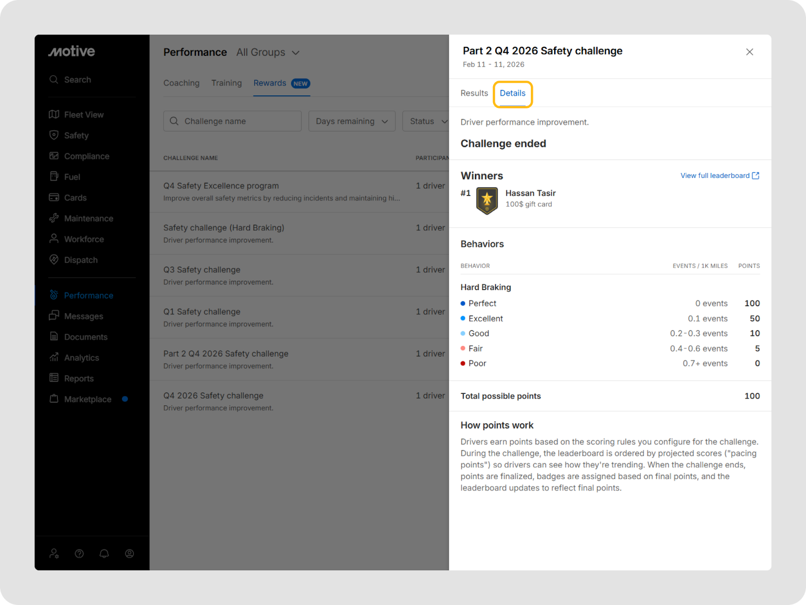 A challenge is a time‑bound program where selected drivers earn points for meeting the safety and performance thresholds you set. At the end of a challenge, drivers are ranked on a leaderboard, and top performers receive the rewards you defined.