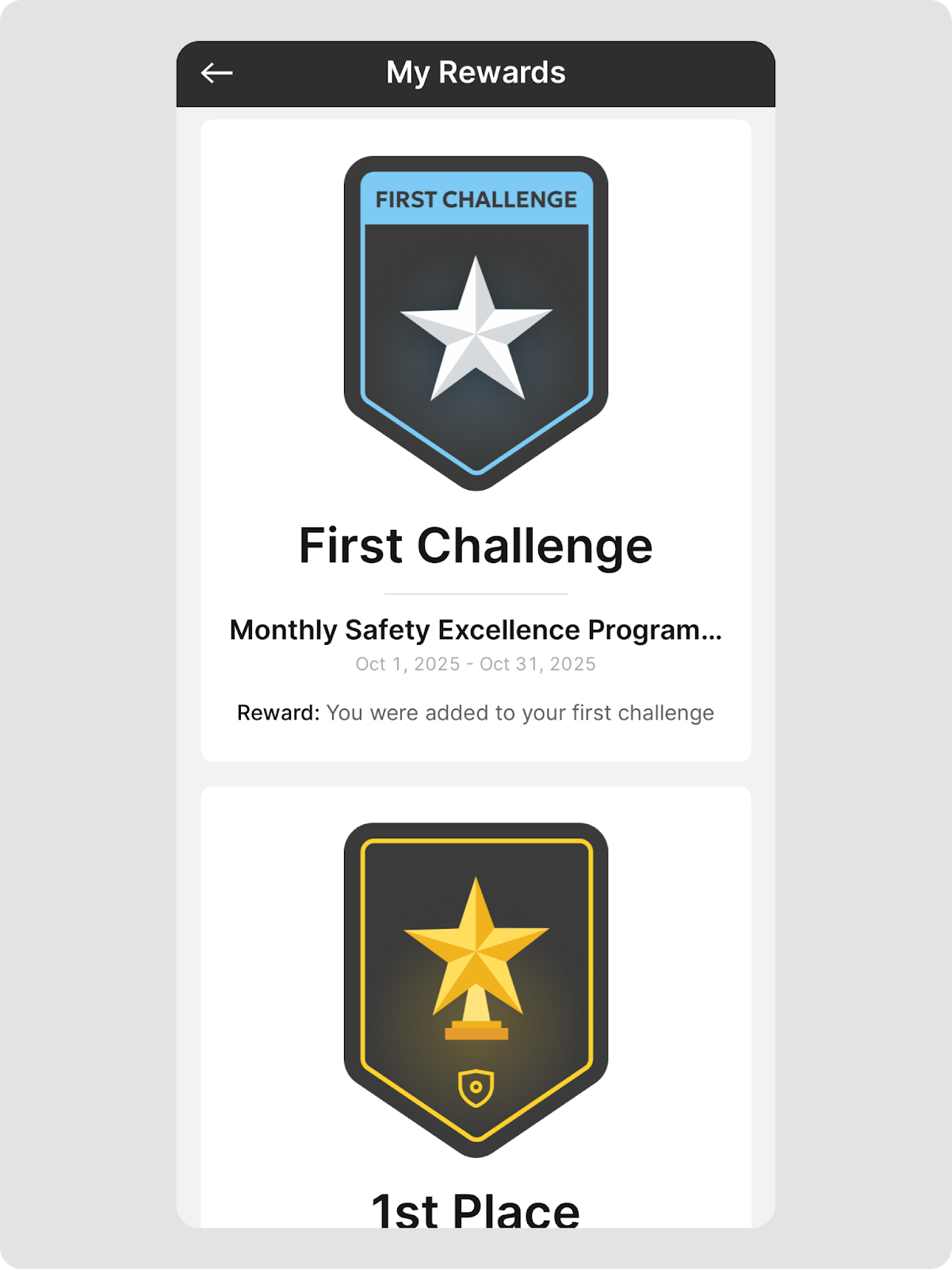 The Rewards feature in the Motive Driver App lets drivers view all their completed, active, and upcoming challenges in one place. For every completed and active challenge, drivers can view its leaderboard and track their ranks, score breakdowns, and earned badges. This helps drivers understand exactly how their driving behavior translates into points, rankings, and rewards.