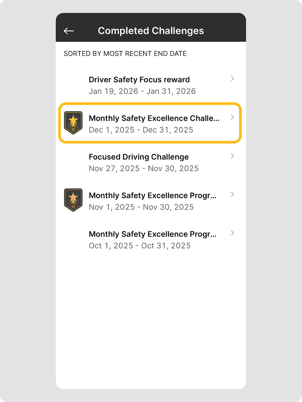 Yes. Drivers can go to Rewards > Completed Challenges to see a list of finished challenges and open any of them to review the leaderboard and final results.