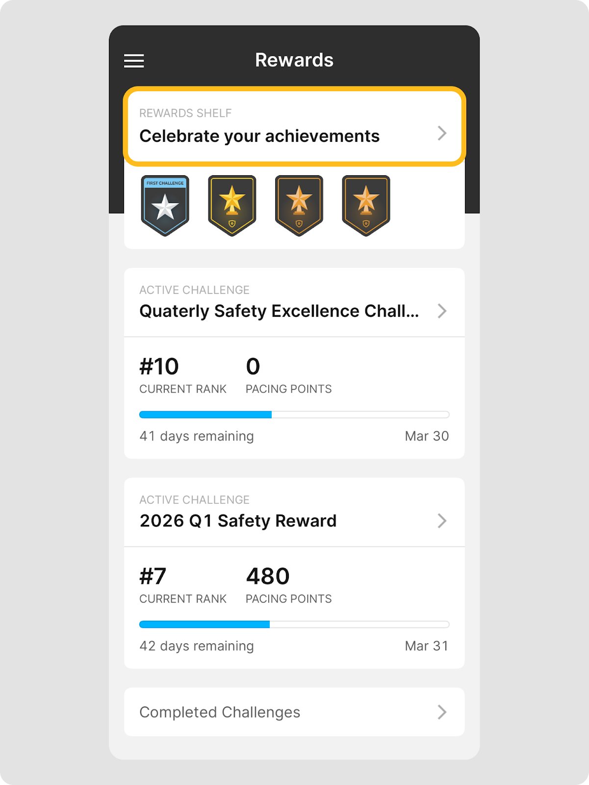 - The Rewards screen displays a Rewards Shelf of all the driver’s earned badges and a list of all active and upcoming challenges.