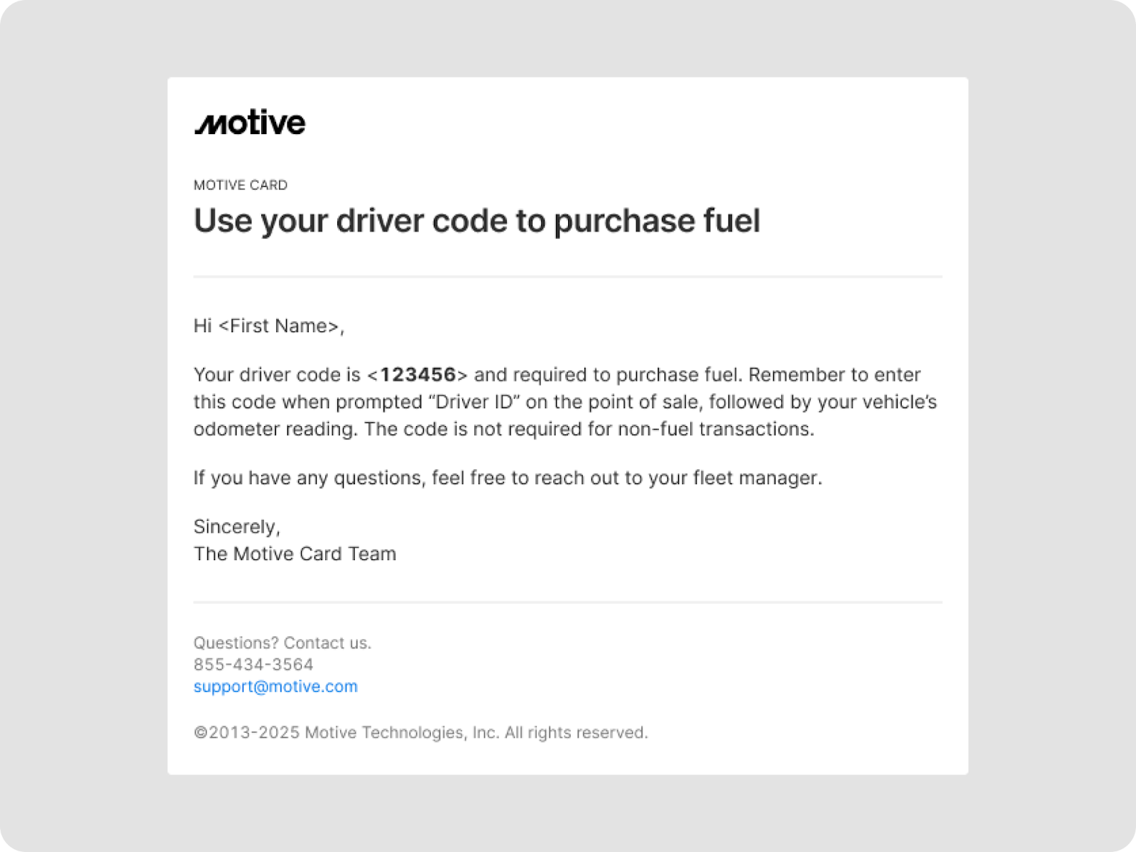 - Reduced internal fraud risk: Uses Motive-generated, six-digit numeric driver codes sent directly to drivers, discouraging insecure practices like reusing shared PINs or using sensitive numbers as PINs.