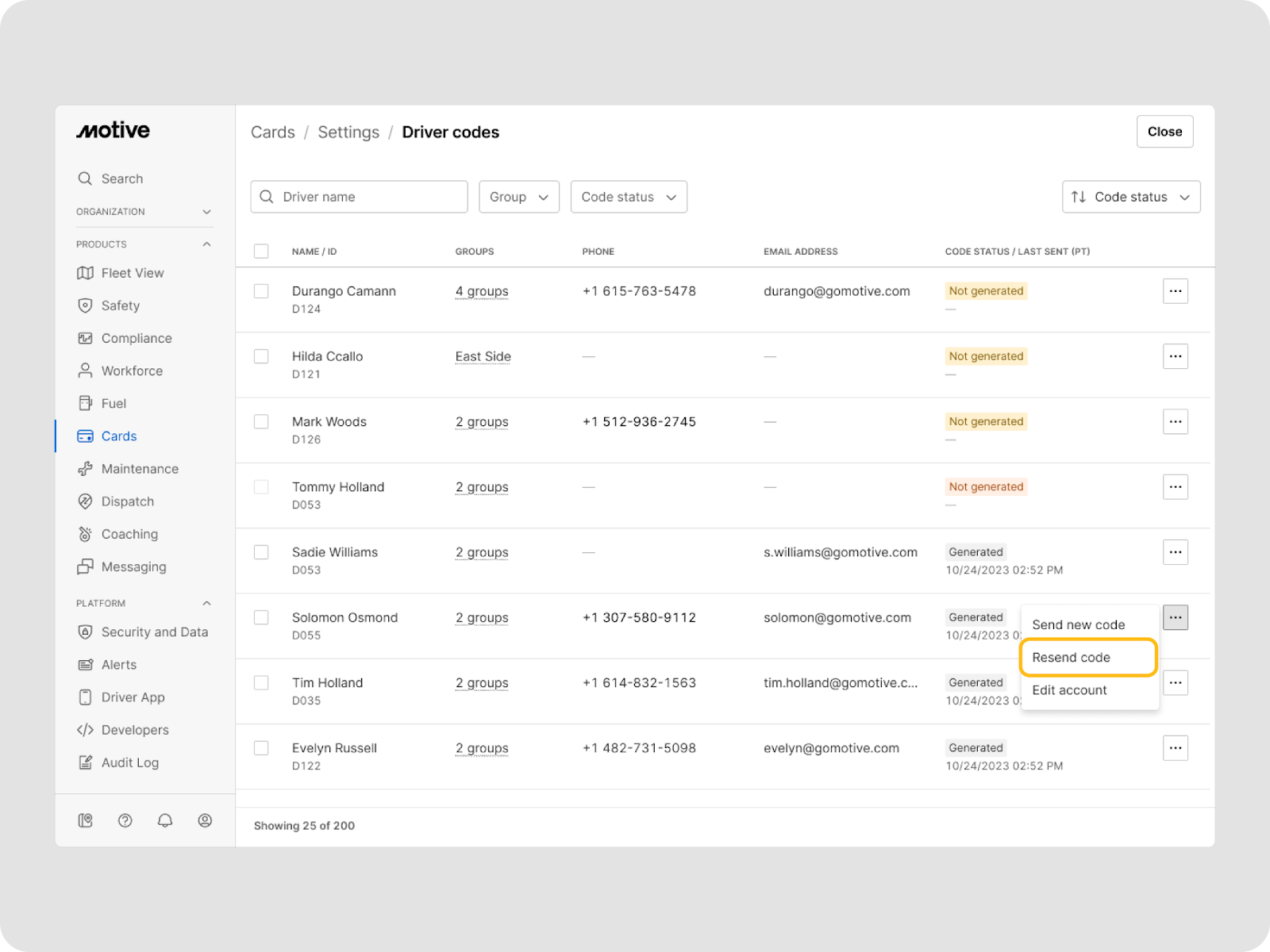 - Search for a driver who has forgotten their code, click the three dots > Resend code.